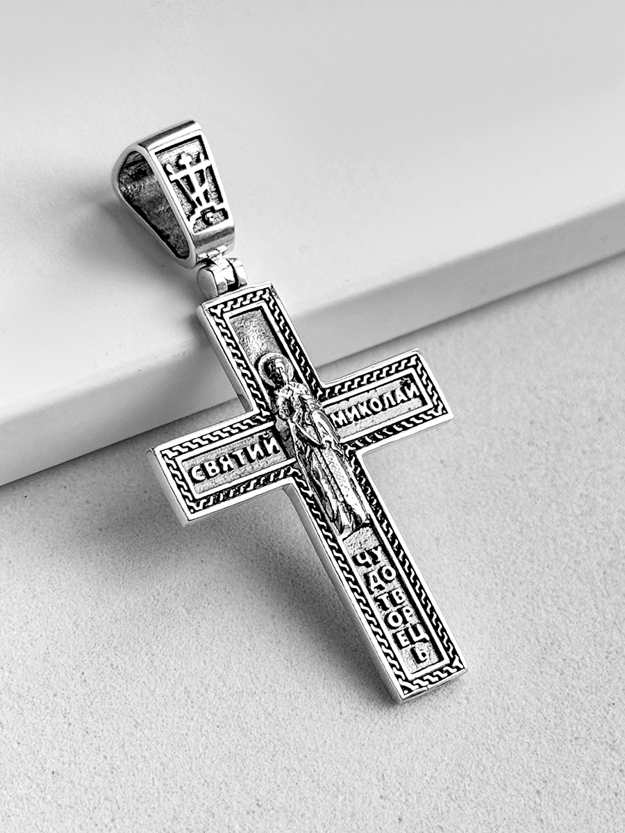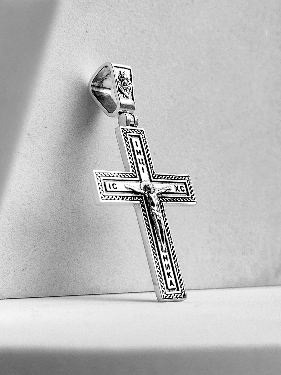 Довершений вручну срібний хрестик 925-ї проби з розп'яттям. Розмір без вушка 33х25 мм.
