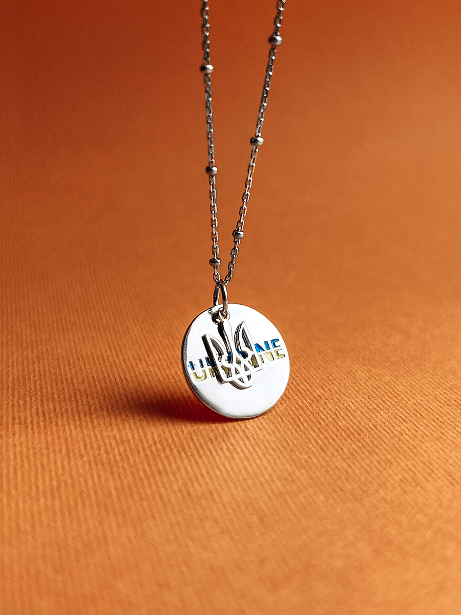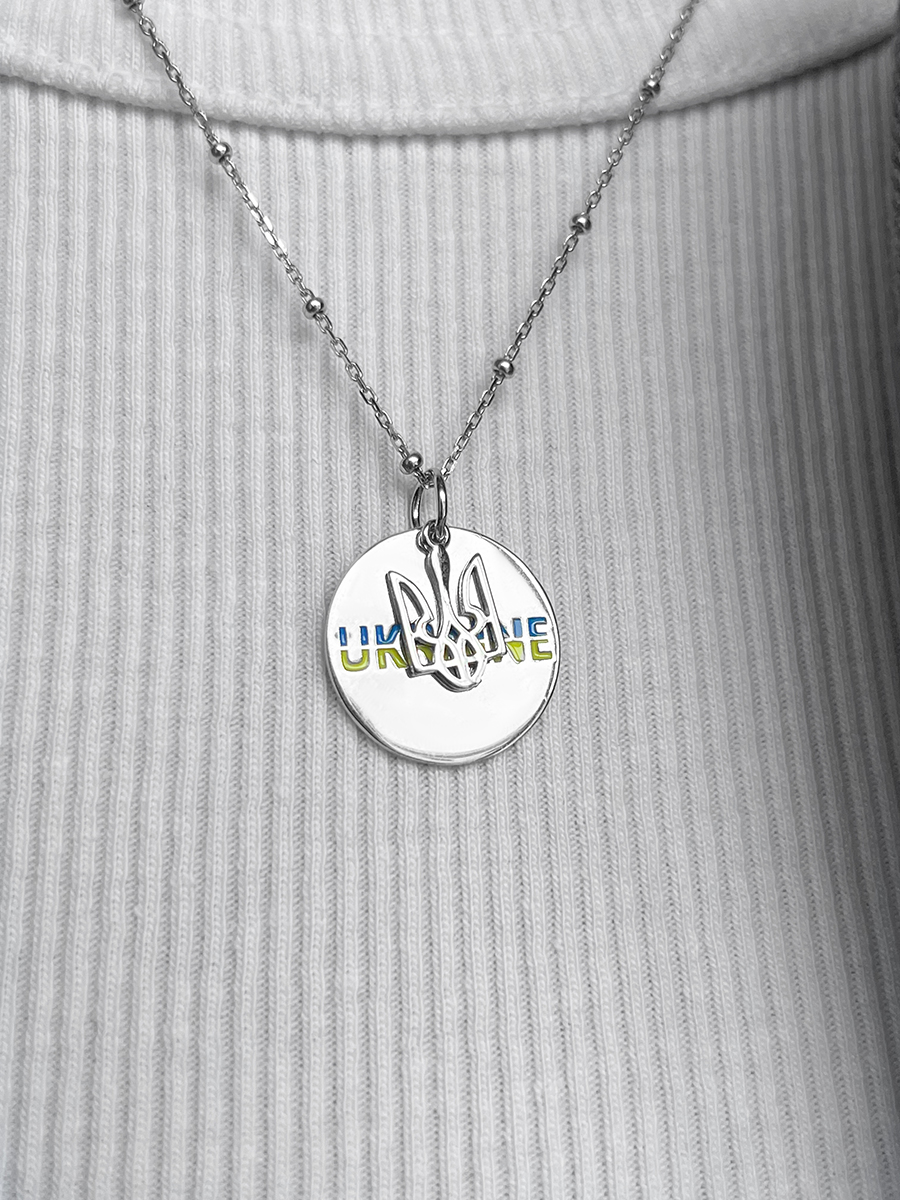 Подвійна срібна підвіска з жовто-блакитною емаллю та тризубом. Чудово доповнить браслети та ланцюжки.