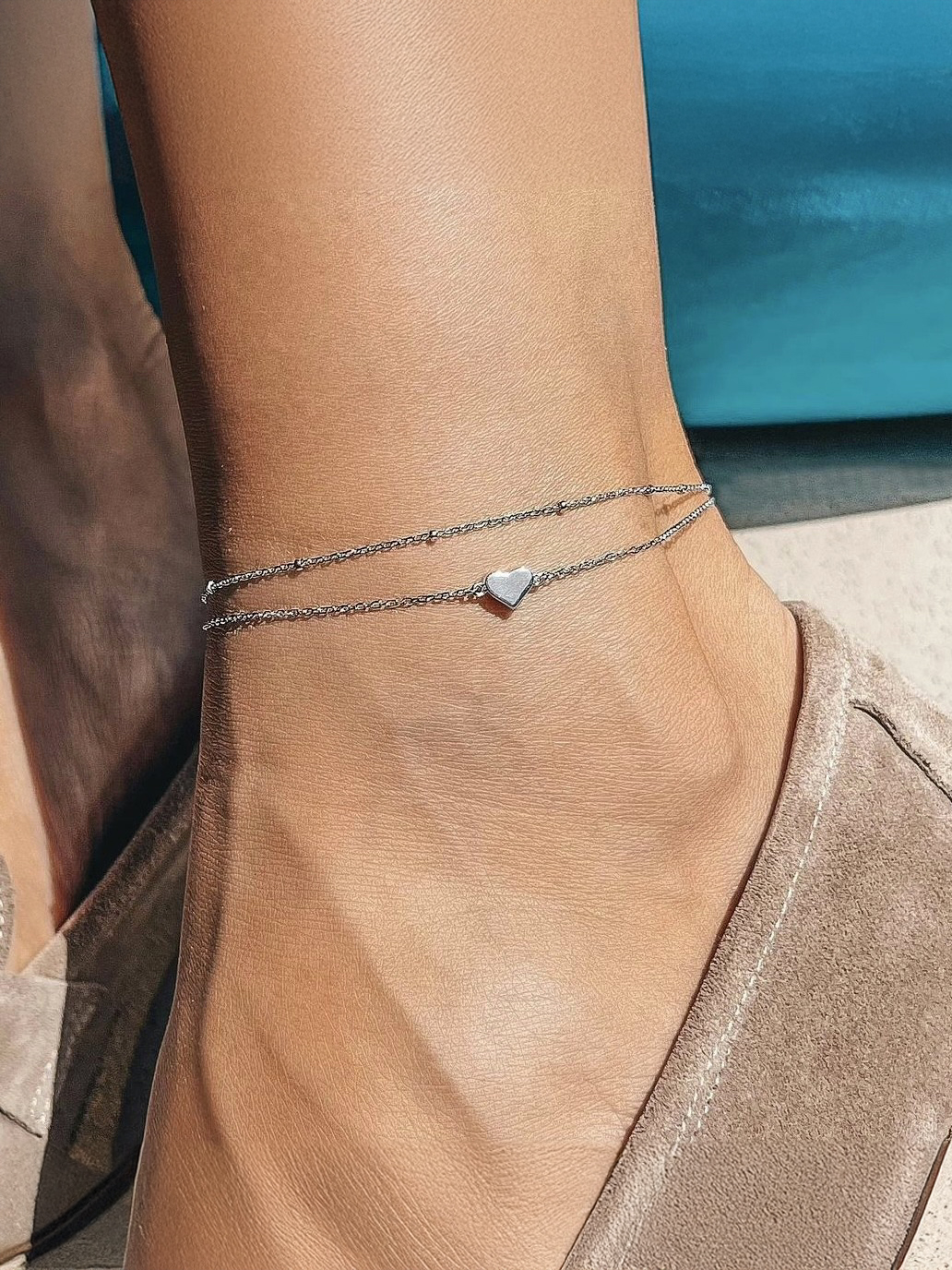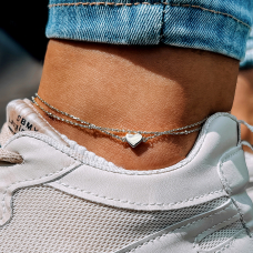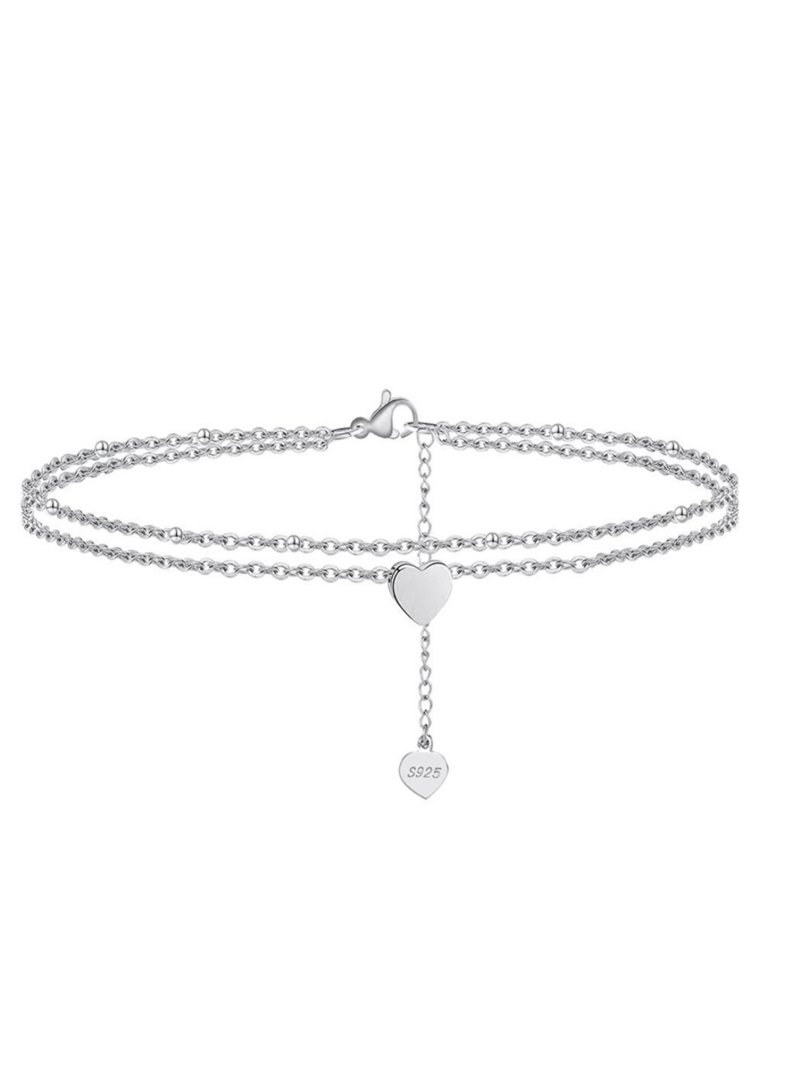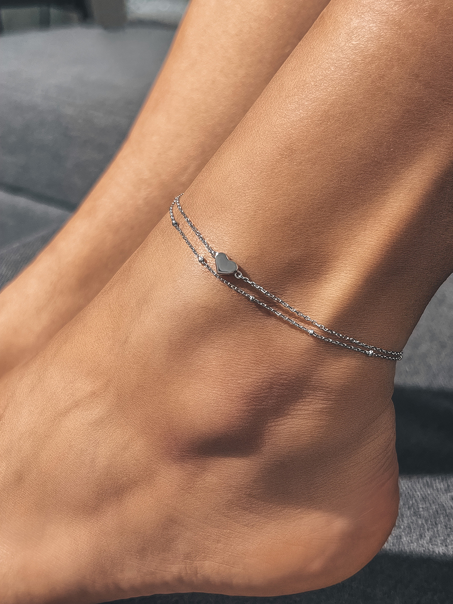 Bransoletka na podwójnych nogach, rodowana, z zawieszką w kształcie serca i wygodną regulacją rozmiaru.
