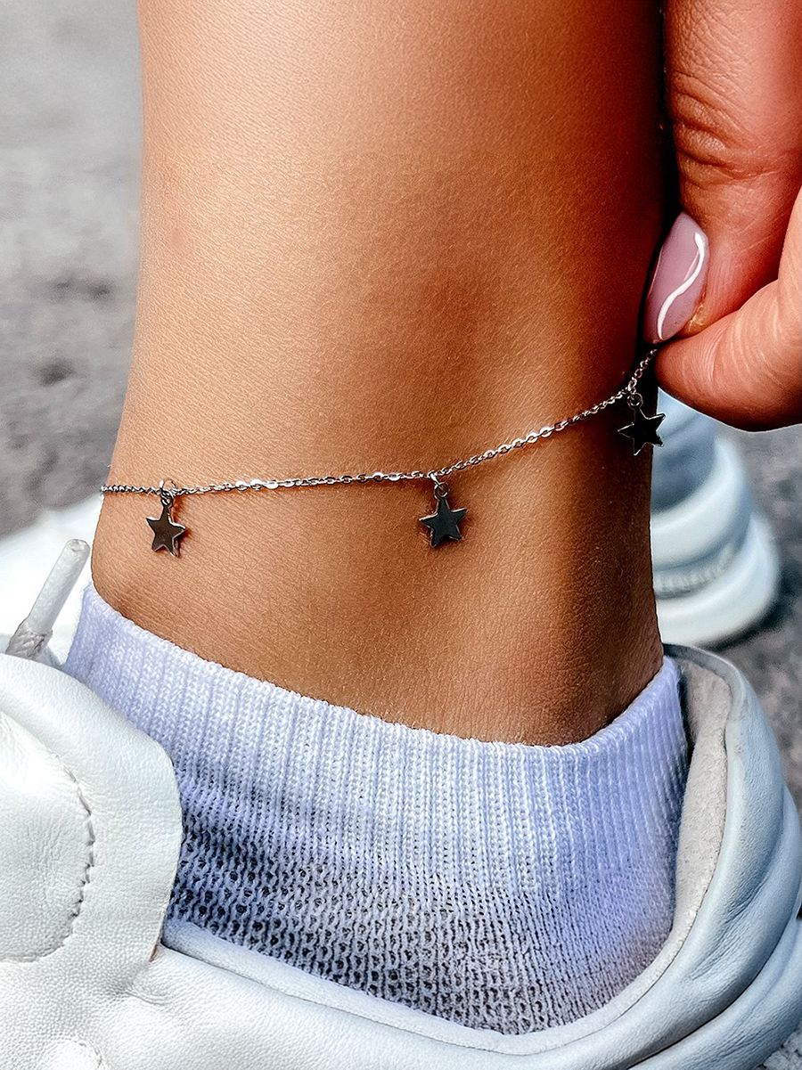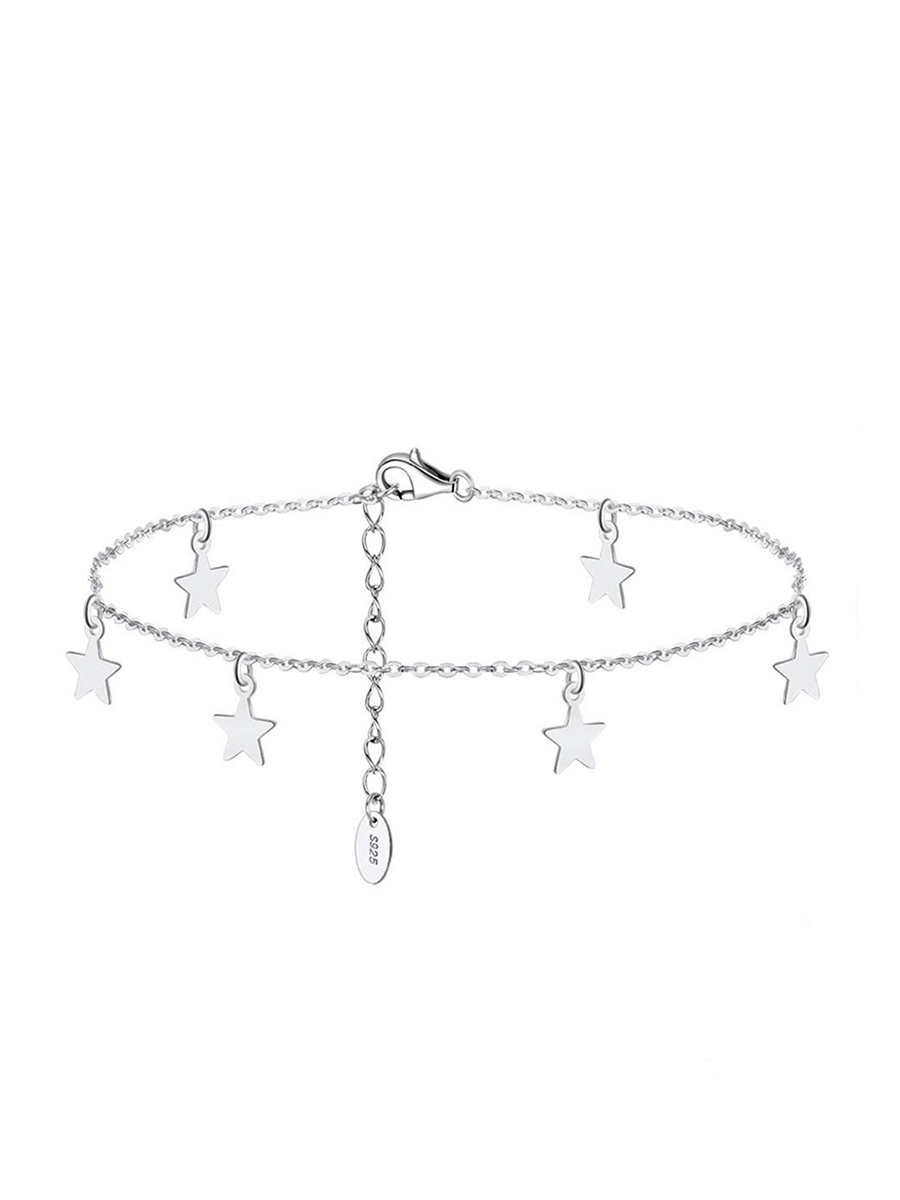 Srebrna bransoletka na nogę z gwiazdkami i wygodną regulacją rozmiaru.