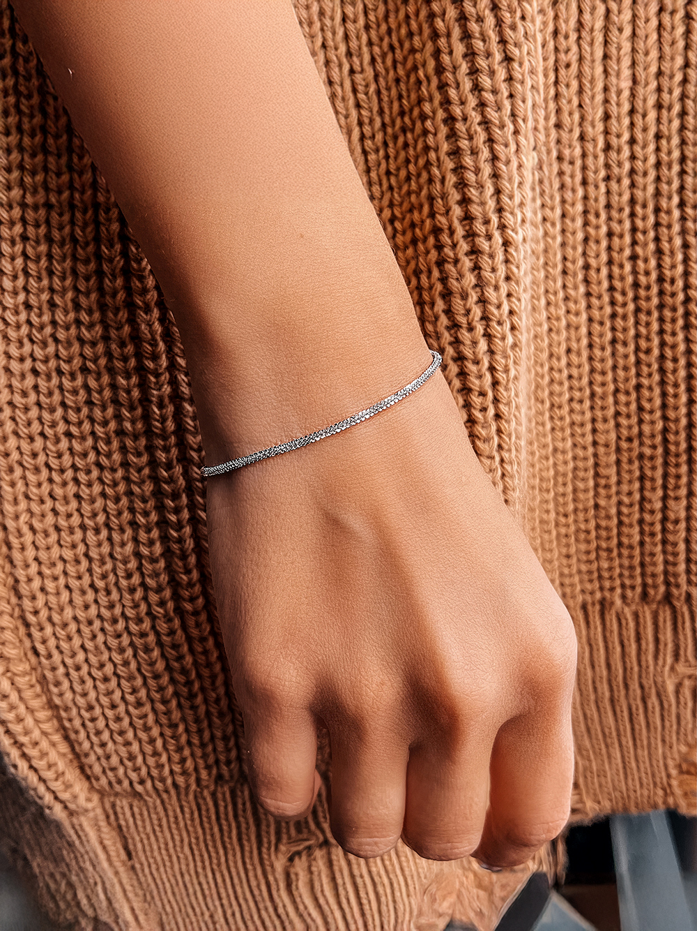 Lakoniczna bransoletka z powłoką rodu i wygodną regulacją rozmiaru.