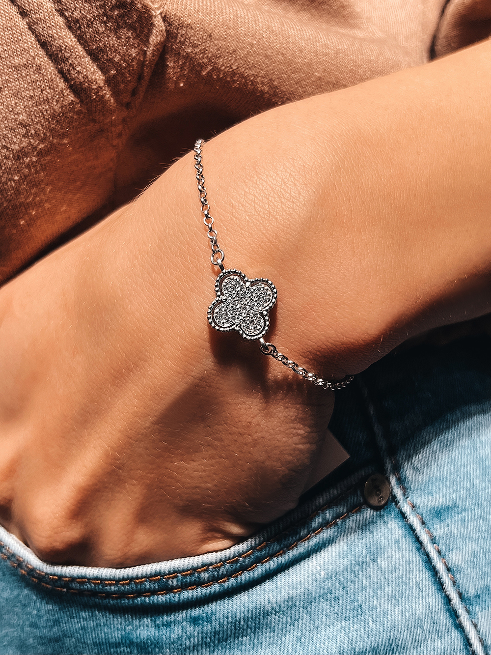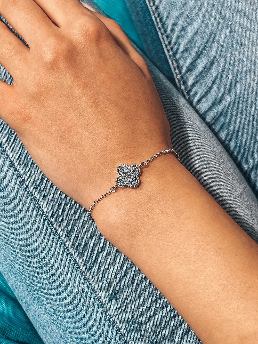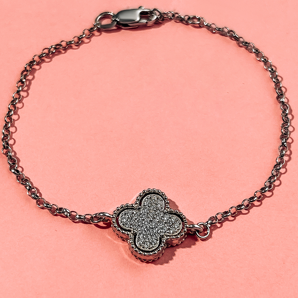 Niesamowita srebrna bransoletka w formie czteroliścia z cyrkoniami, które przy każdym ruchu mienią się kolorowymi promieniami i urzekają grą świateł ©