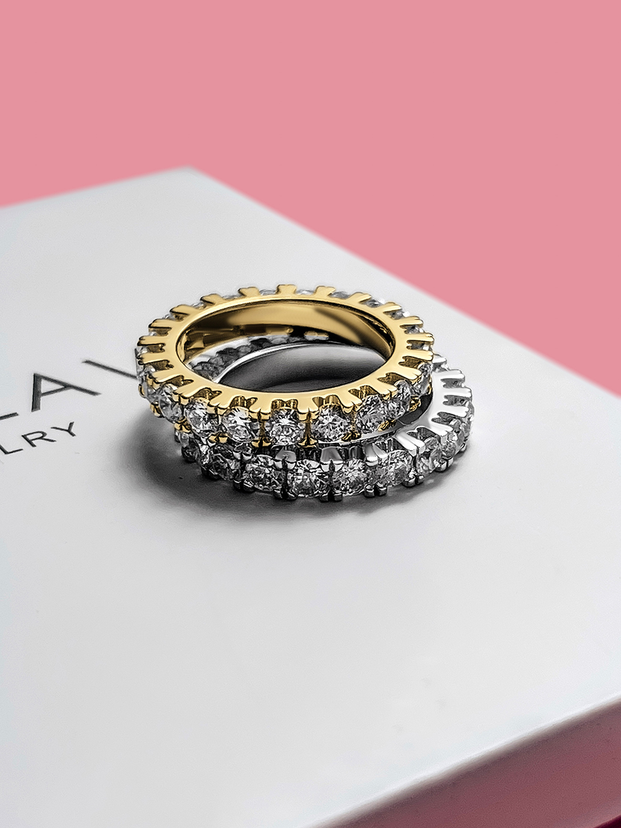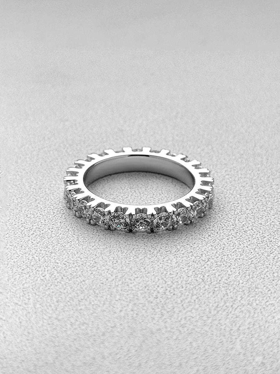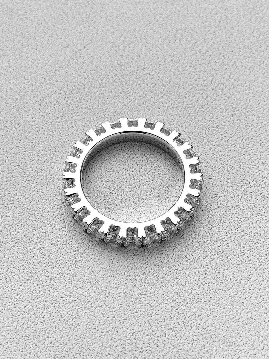 Ręcznie wykończony pierścionek ze srebra próby 925, ozdobiony błyszczącym rzędem cyrkonii sześciennych o szlifie diamentowym, które przy każdym ruchu tworzą czarującą grę świateł. Biżuterię można nosić zarówno samodzielnie, jak i w połączeniu z innymi pierścionkami.