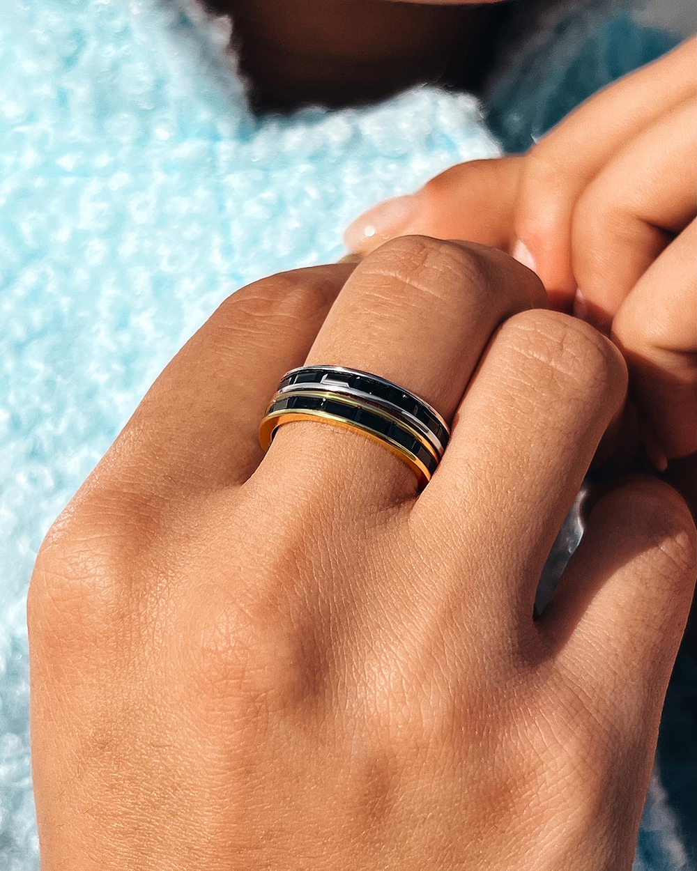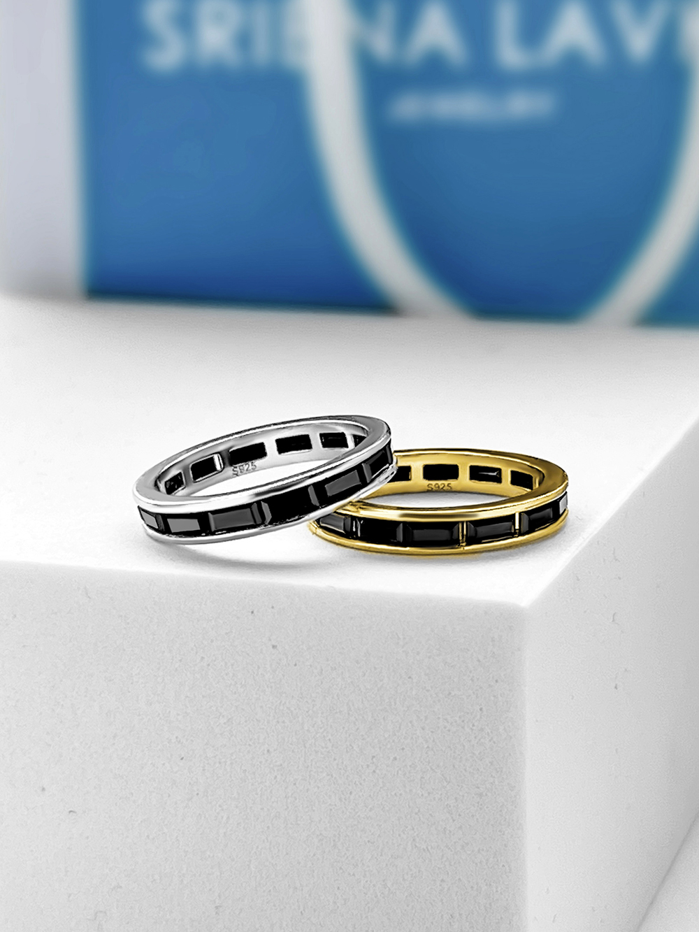 Lakoniczny srebrny pierścionek ze złoceniem i czarną cyrkonią sześcienną.