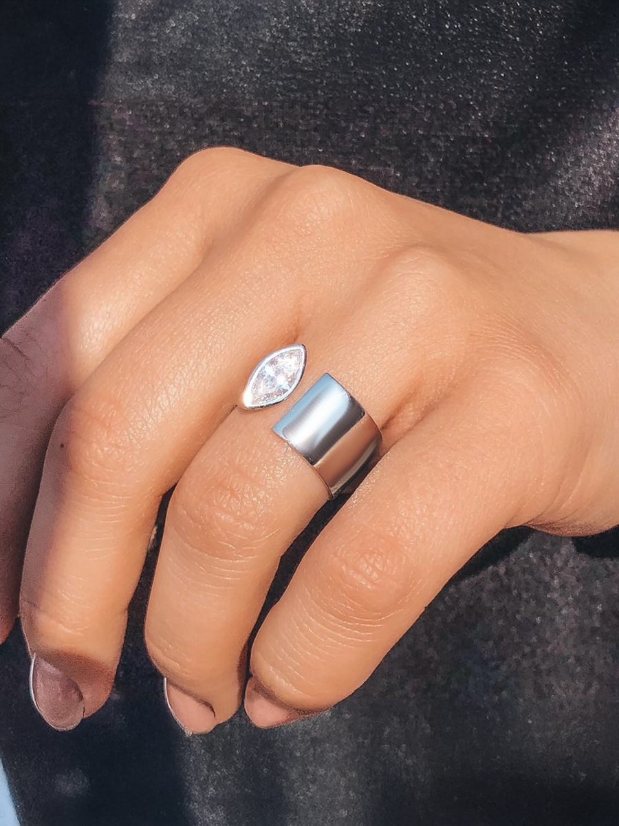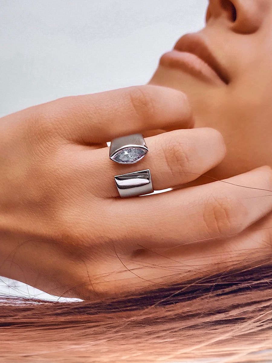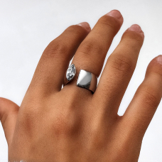 Stylowy otwarty pierścionek wykonany ze srebra z rodowaniem i cyrkoniami sześciennymi.