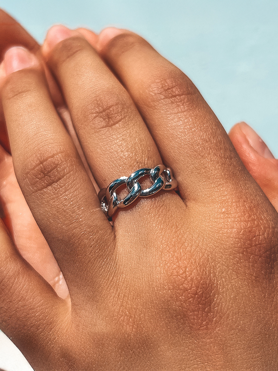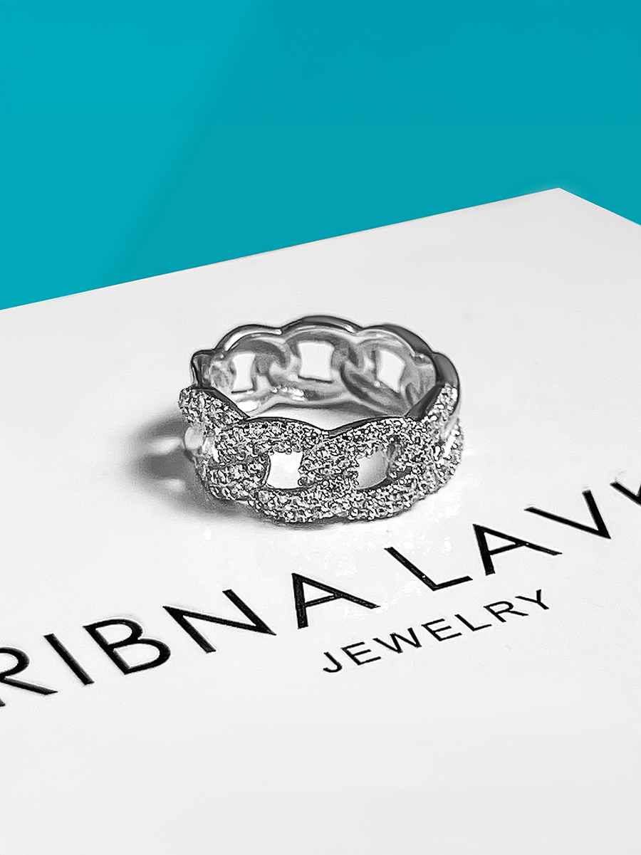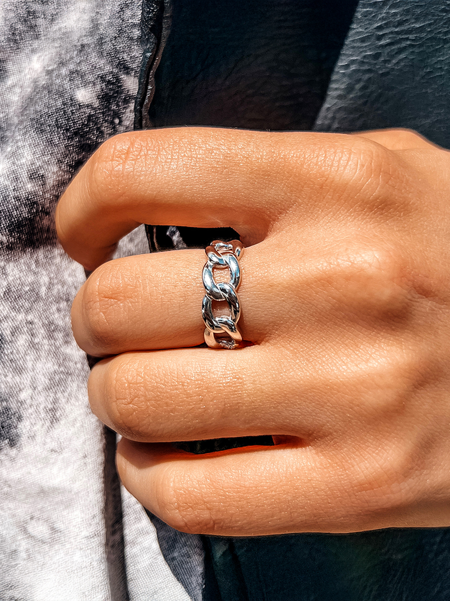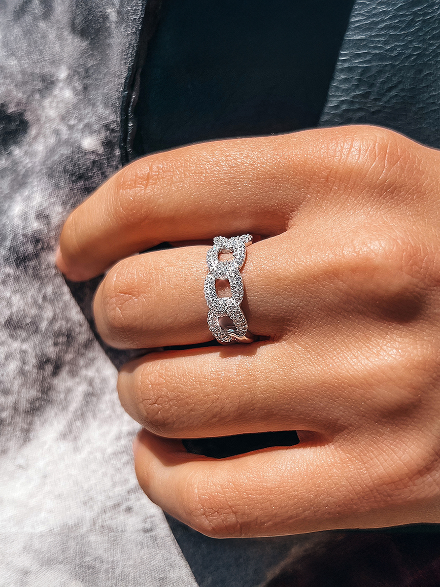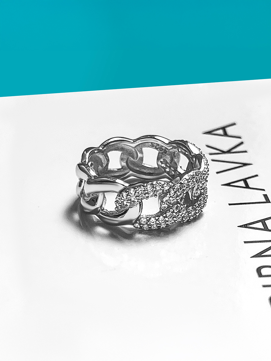 Spektakularny i stylowy srebrny pierścionek o podwójnym wzorze.
