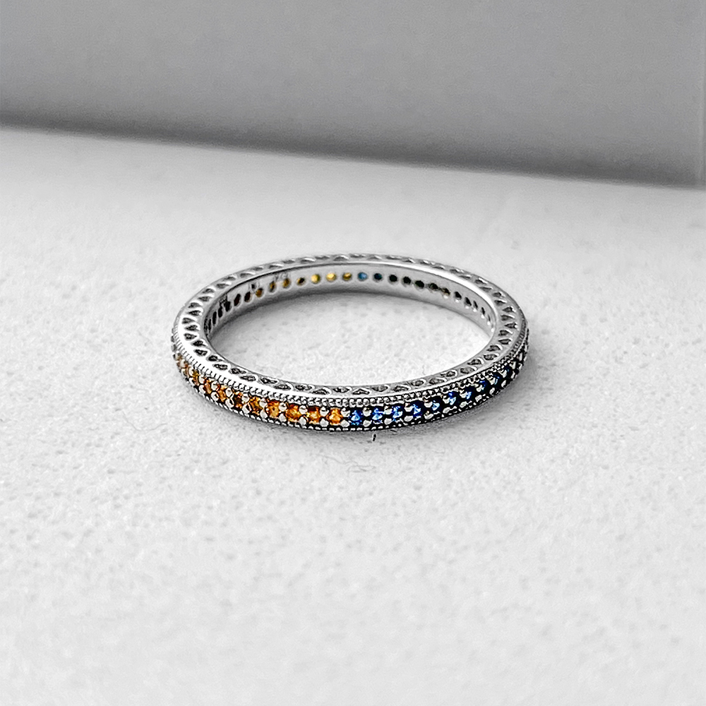 Błyszczący pierścionek z żółto-niebieskimi cyrkoniami sześciennymi na całej długości.