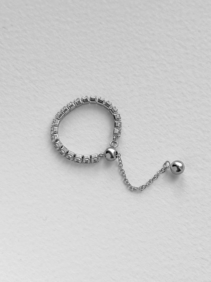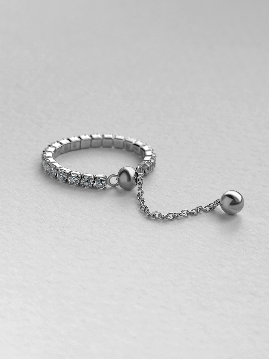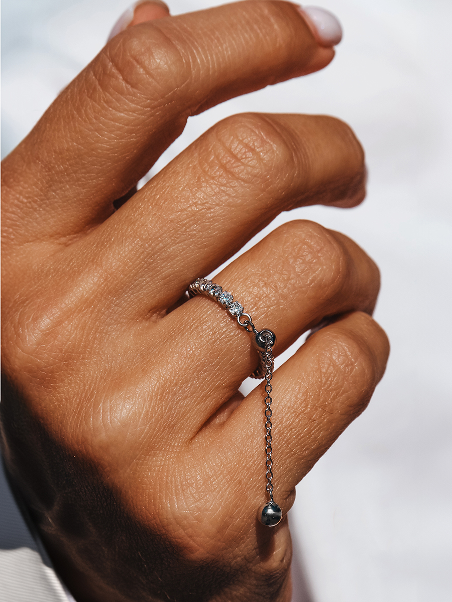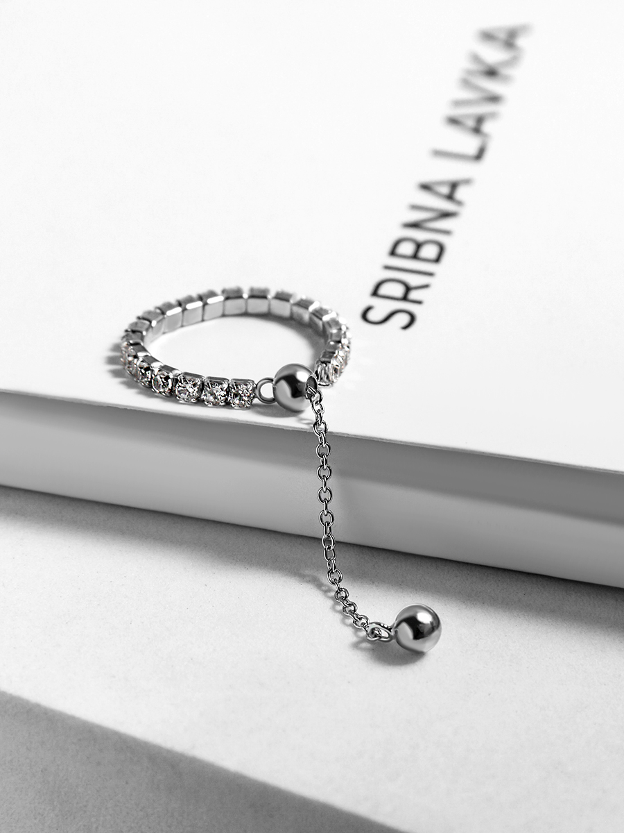 Niezwykły srebrny pierścionek w formie elastycznej ścieżki cyrkonii. Rozmiar jest regulowany. Może służyć jako falanga. Noś jako samodzielną dekorację lub połącz z innymi pierścionkami.