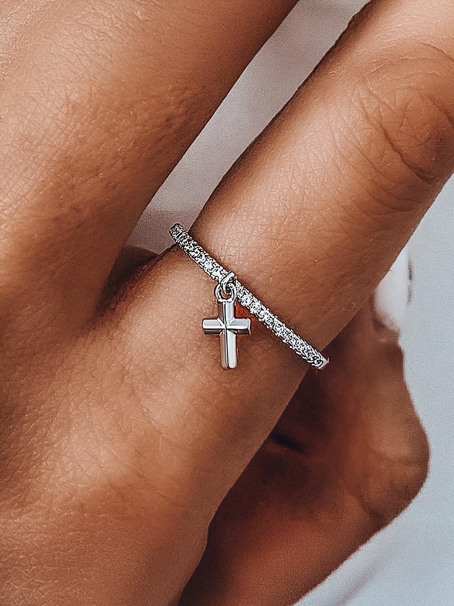 Srebrny pierścionek z cyrkonią i zawieszką w kształcie krzyża.
