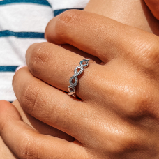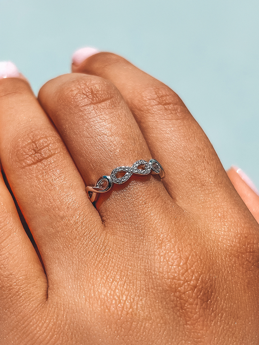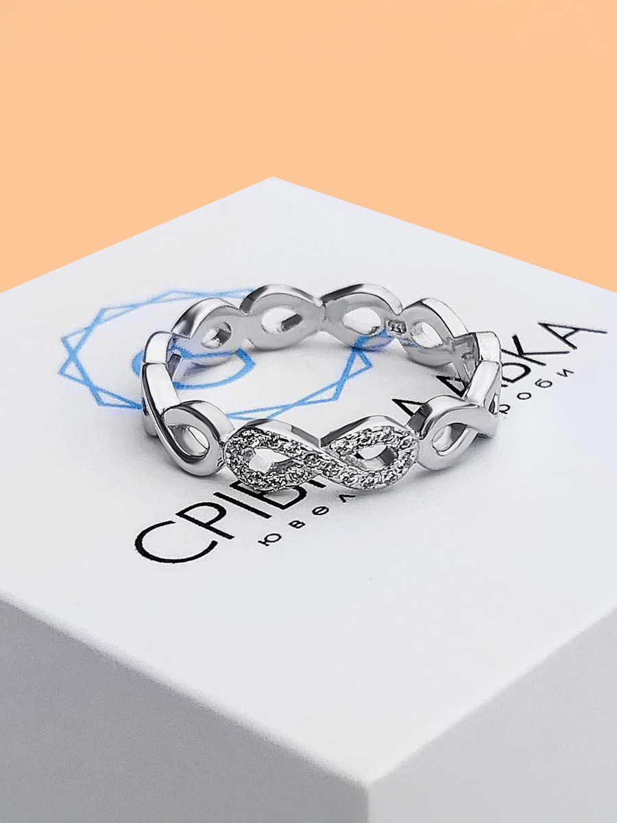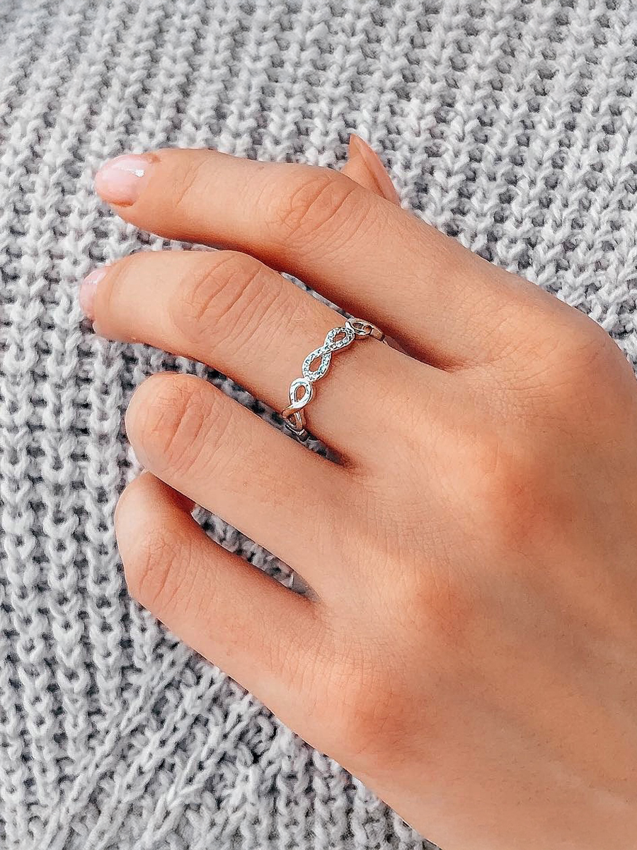 Pierścionek srebrny „Nieskończoność”. Pierścionek można nosić zarówno jako samodzielną ozdobę, jak i w połączeniu z innymi pierścionkami.