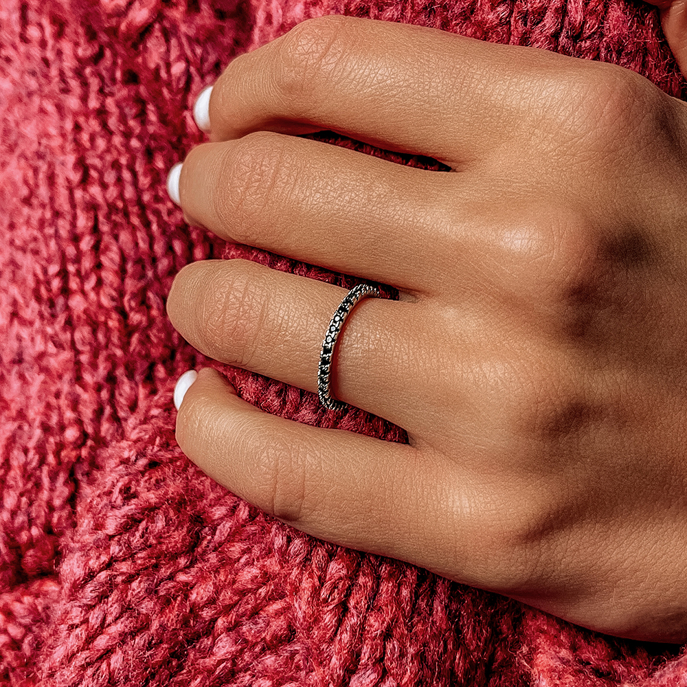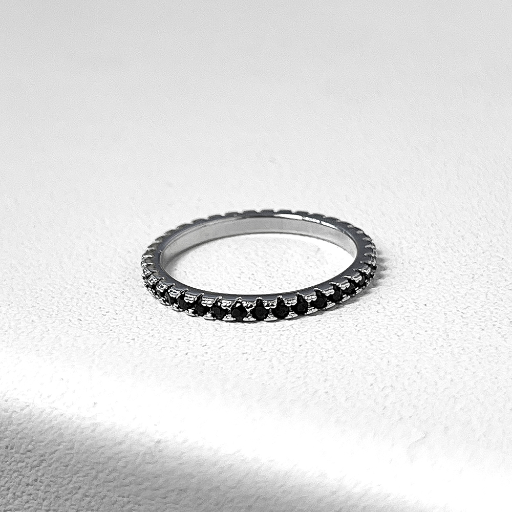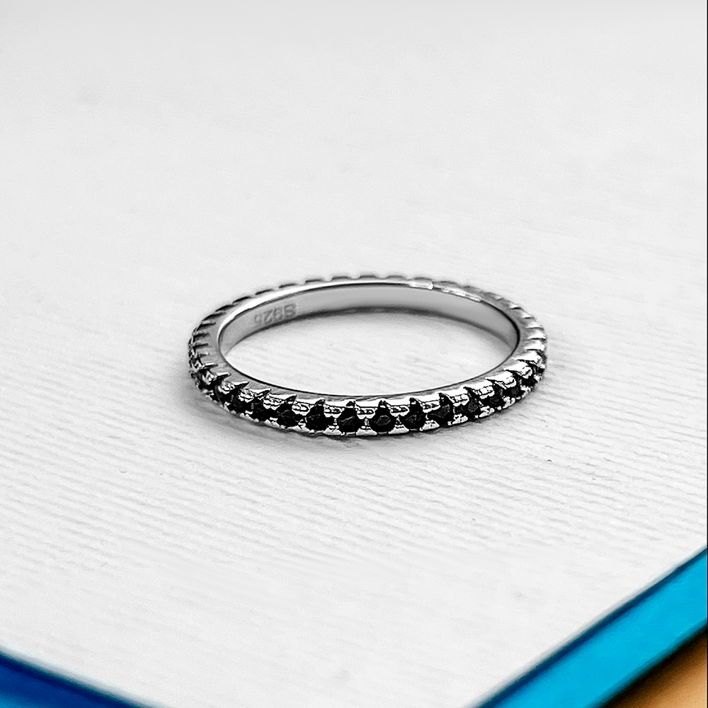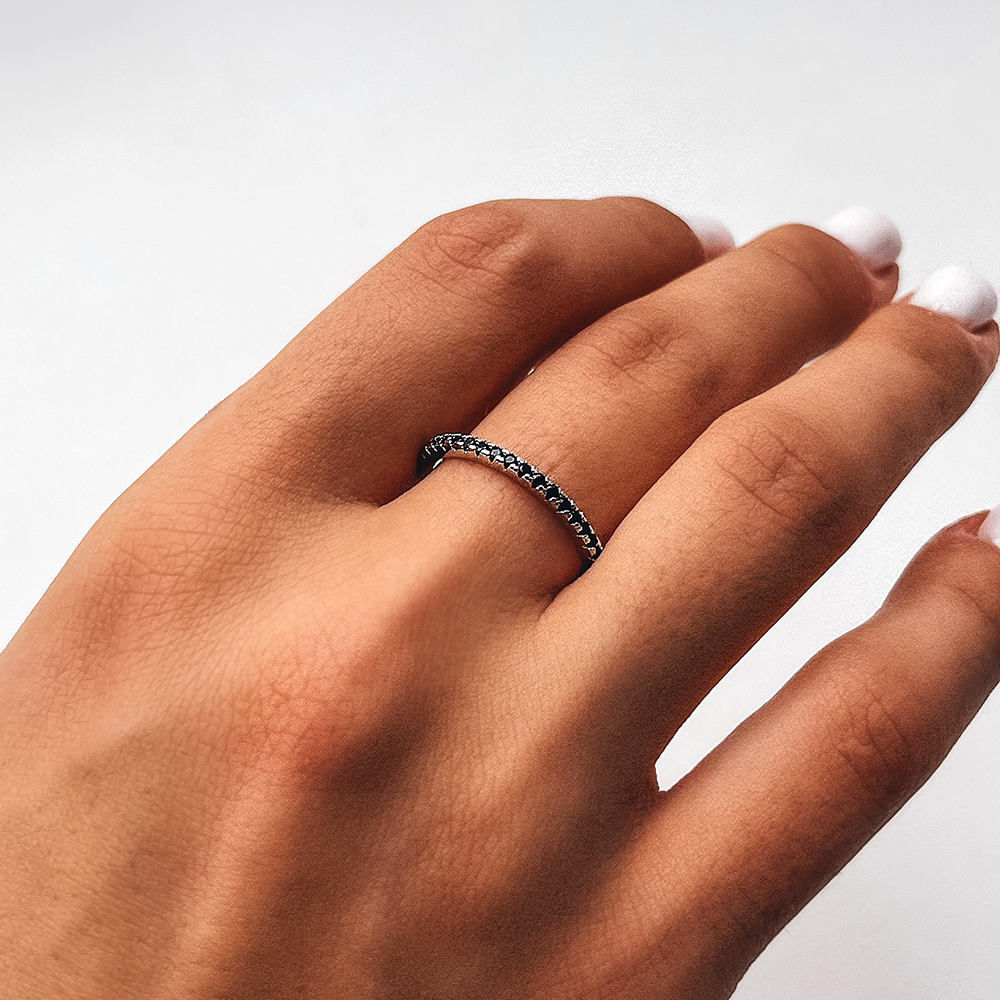 Promienny srebrny pierścionek z rodem i czarną cyrkonią sześcienną o szlifie diamentu.