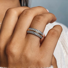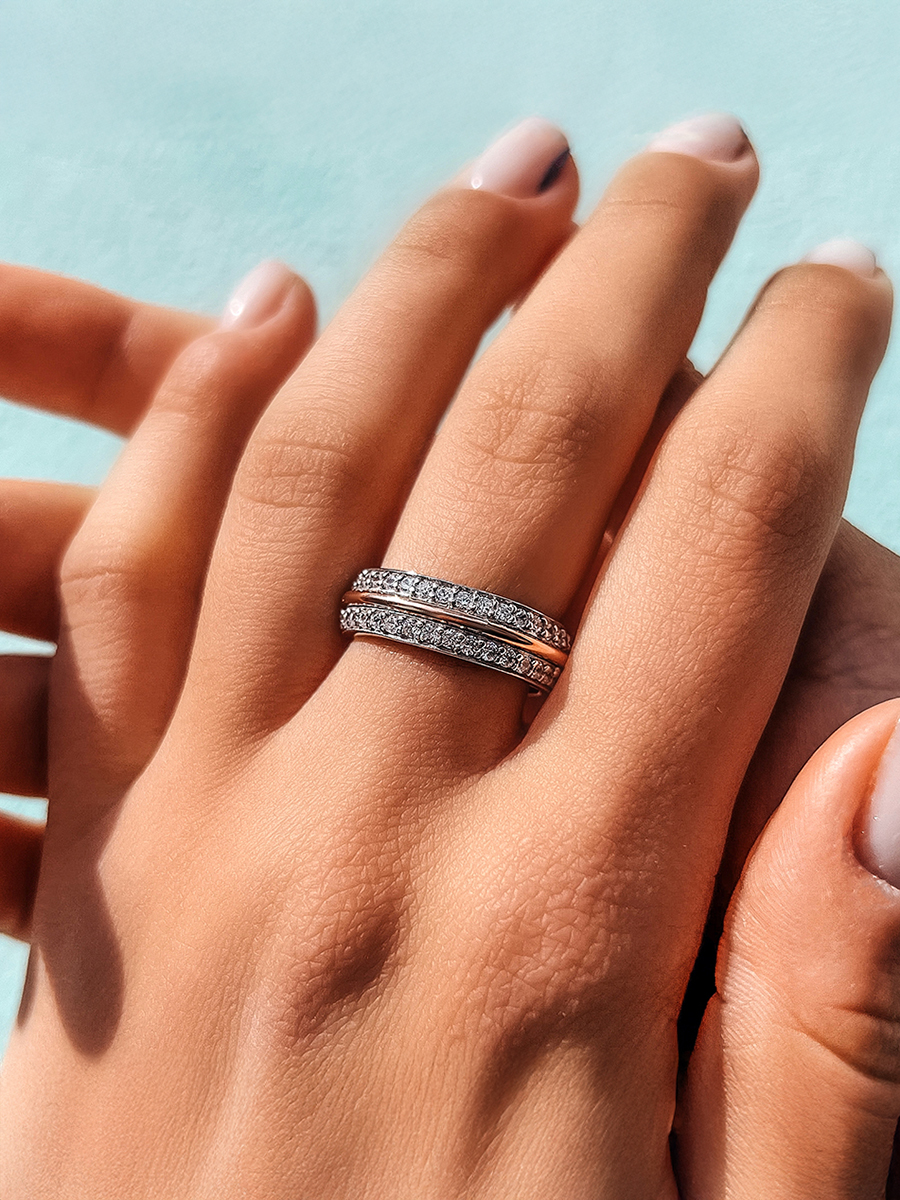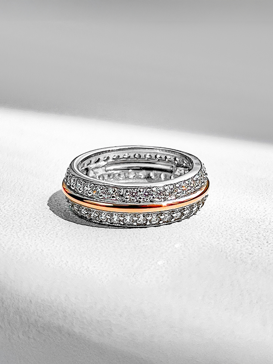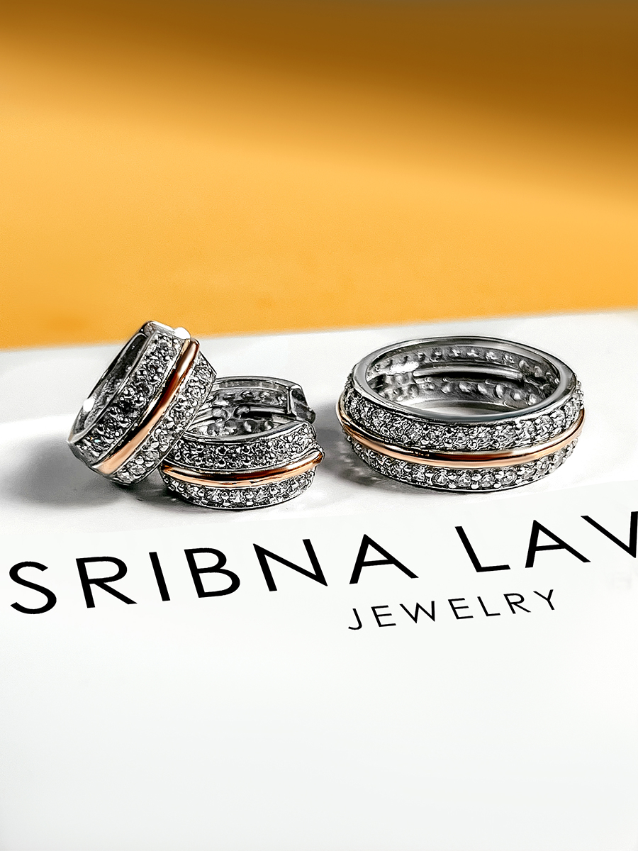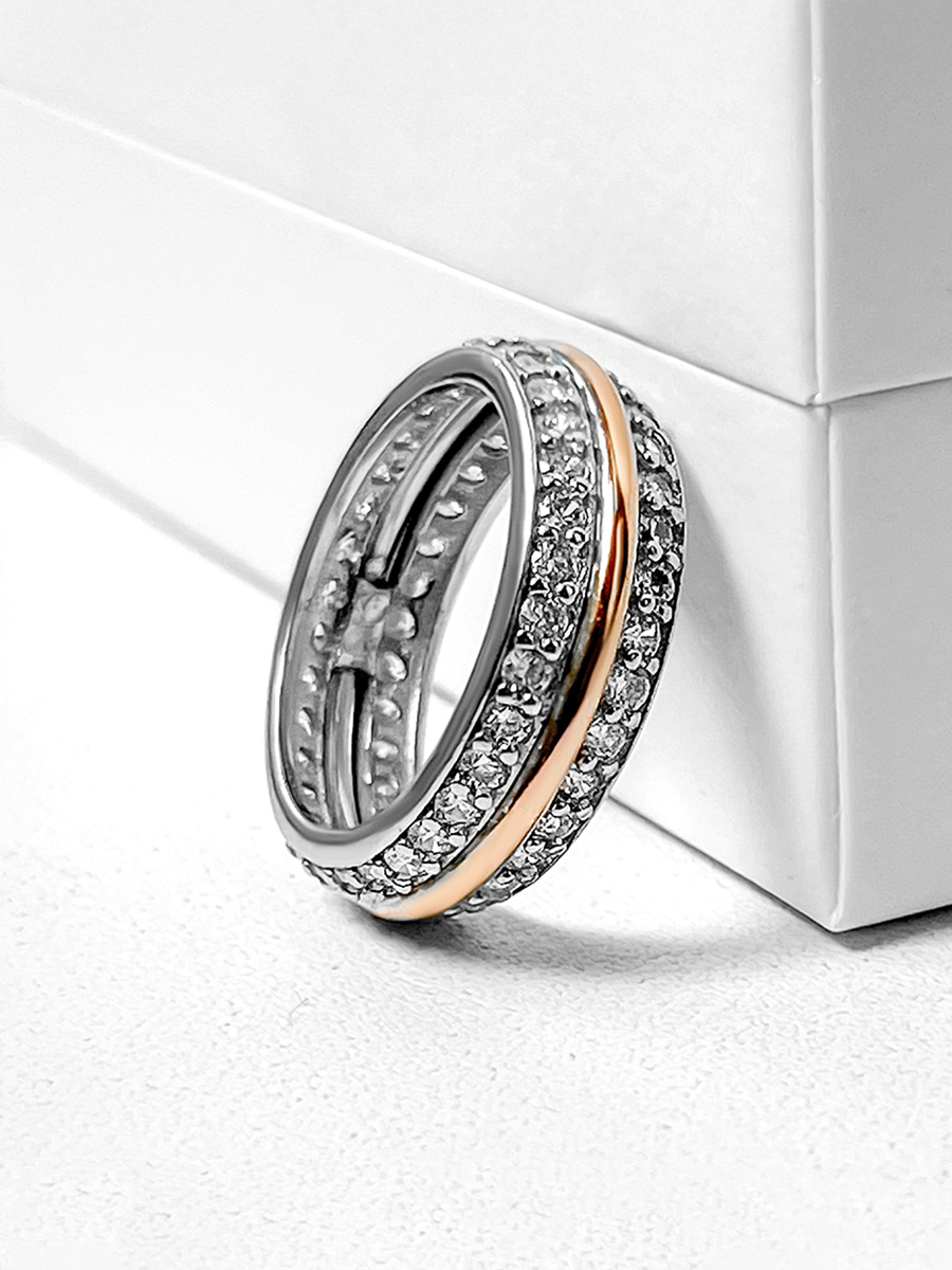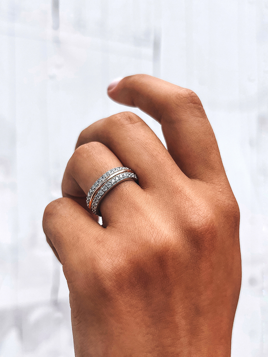 Stylowy i niepowtarzalny srebrny pierścionek ozdobiony wstawkami z naturalnego złota i cyrkoniami sześciennymi o szlifie diamentowym.