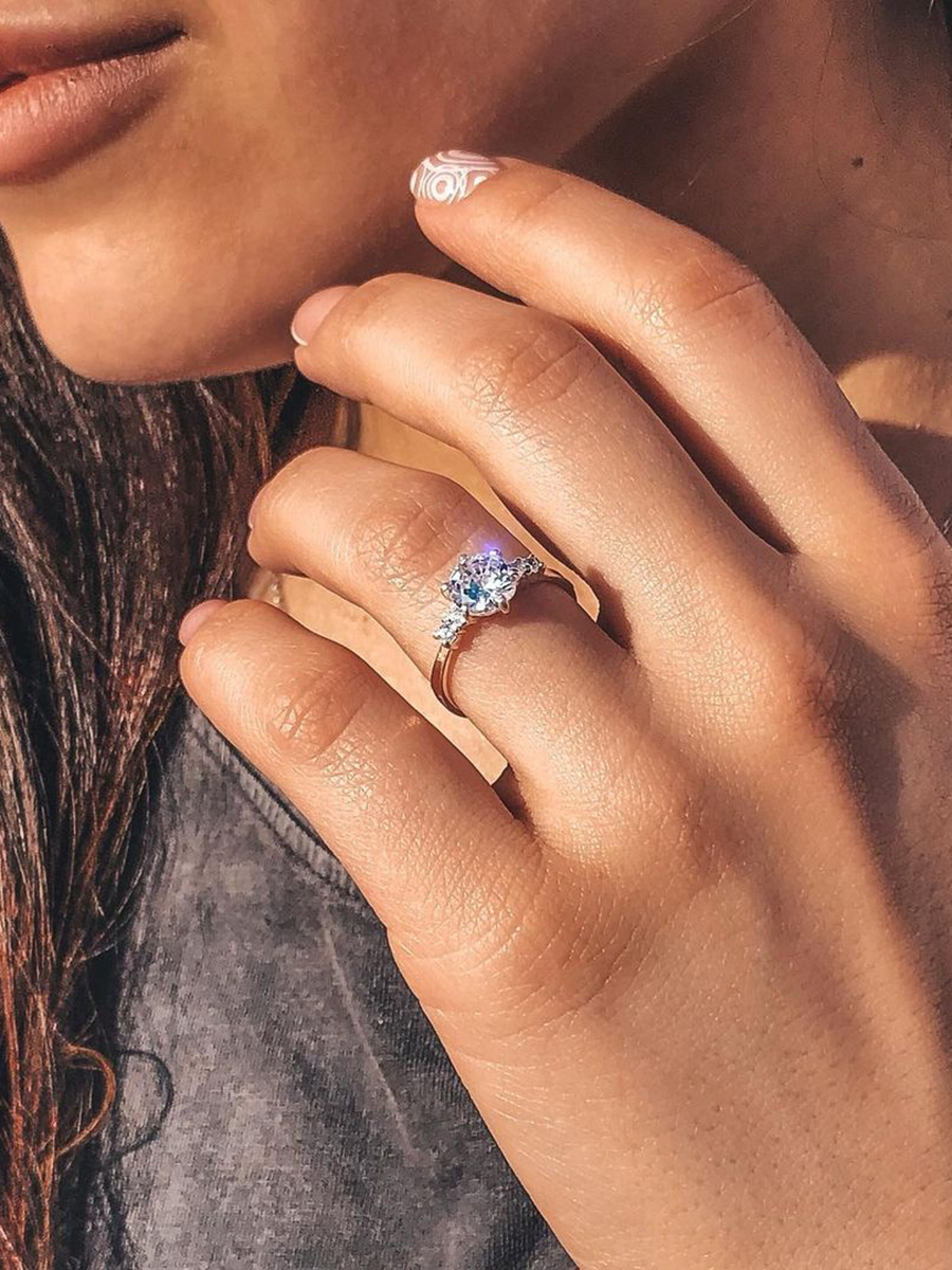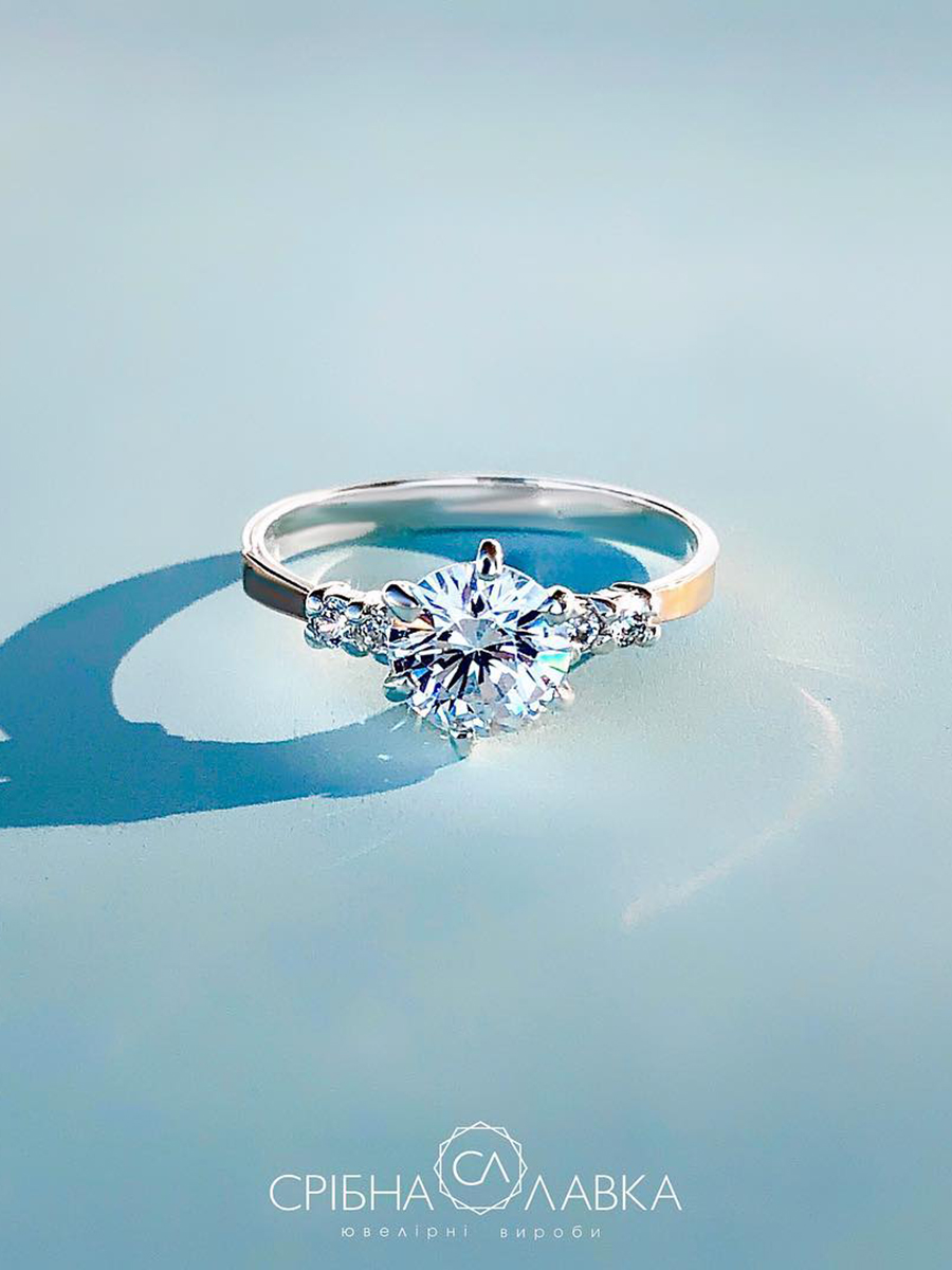 Srebrny pierścionek ozdobiony jest wstawkami z naturalnego złota i cyrkoniami sześciennymi o szlifie diamentowym.