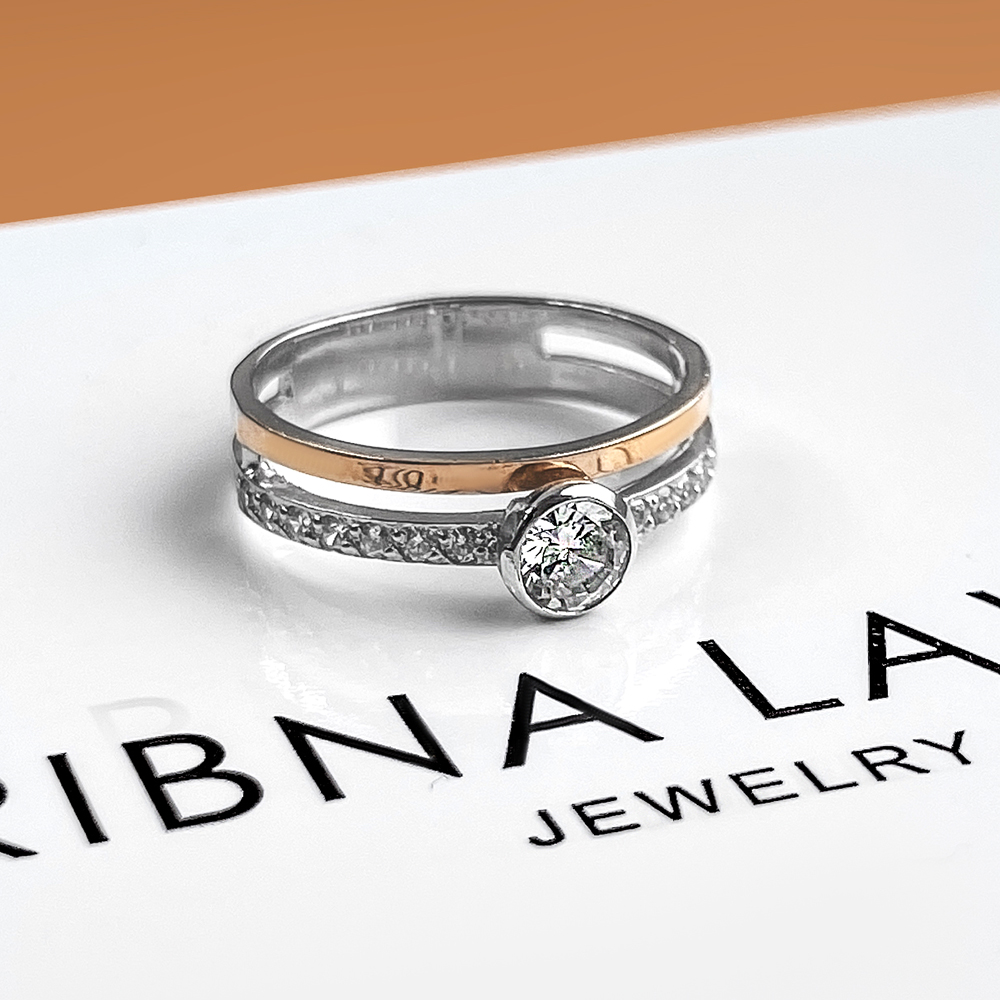 Srebrny pierścionek ze wstawkami z naturalnego złota i cyrkoniami sześciennymi o szlifie diamentowym.