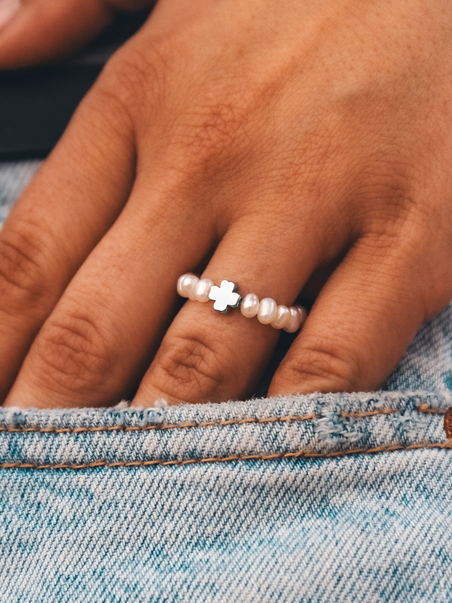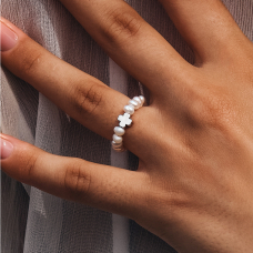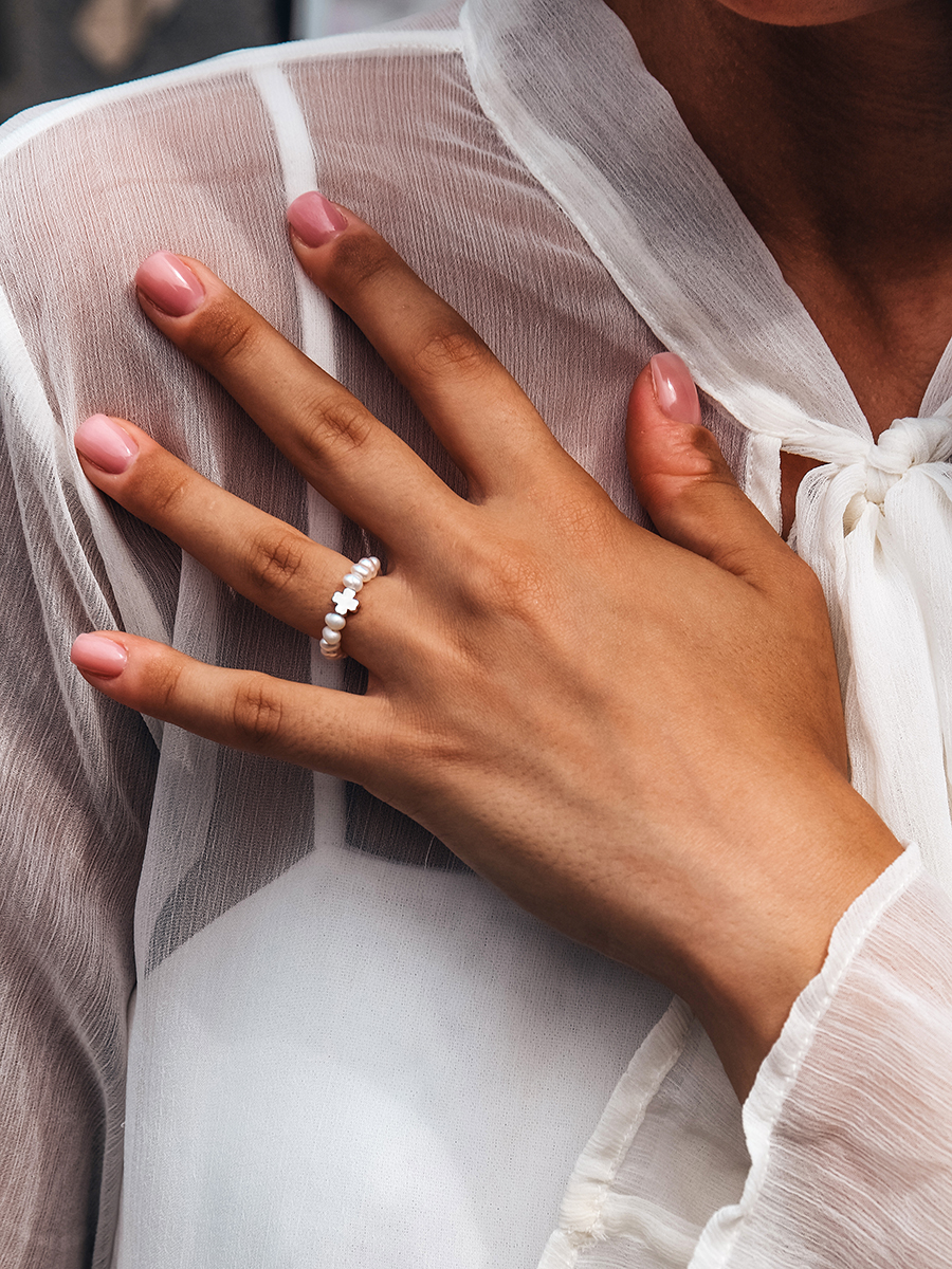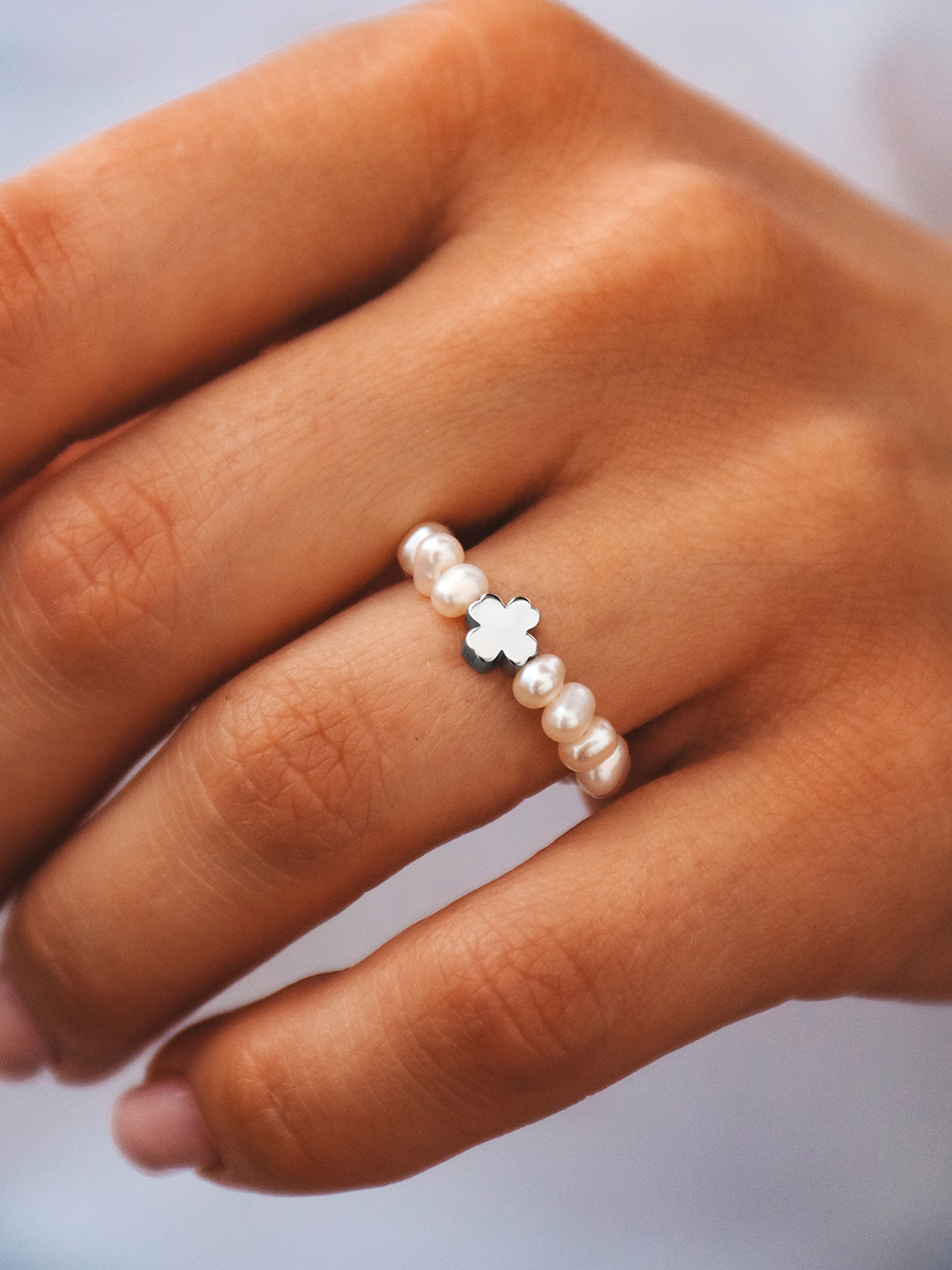 Niezwykły pierścionek wykonany z naturalnych pereł i srebra. Podstawą jest jubilerska gumowa żyłka. Swoją drogą, ten model świetnie wygląda w różnych zestawieniach, dlatego mieszaj i twórz niepowtarzalne zestawy.