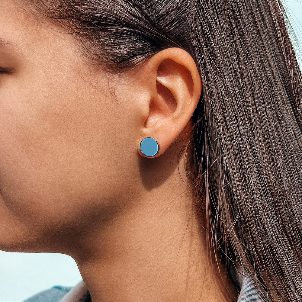 Srebrne kolczyki z zapięciem śrubowym i niebieską emalią.