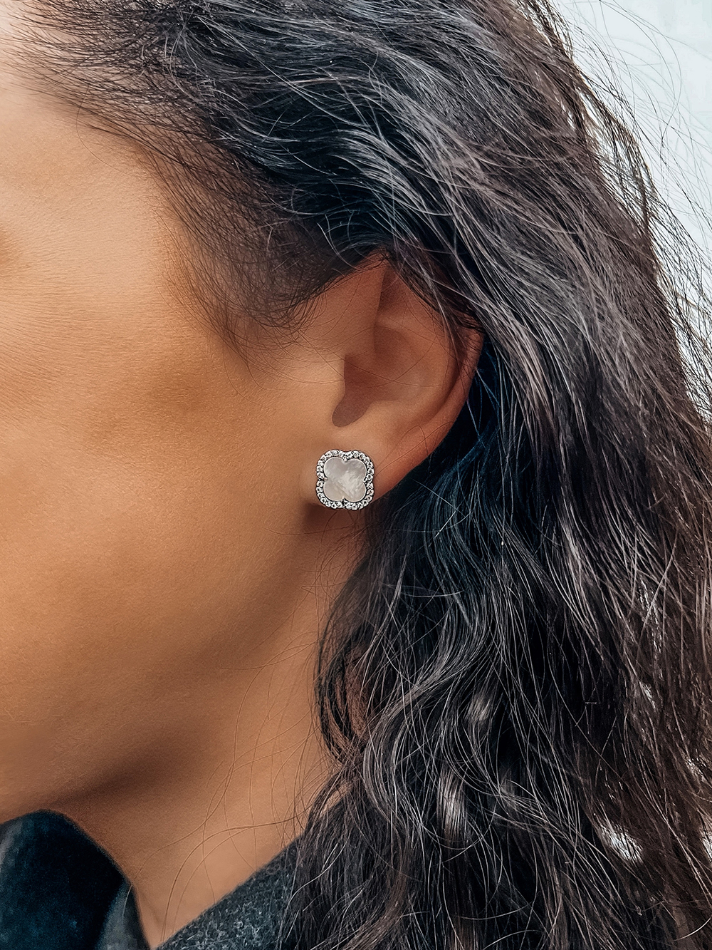 Jasne, rodowane kolczyki z cyrkoniami sześciennymi o szlifie diamentowym, masą perłową i przykręcanymi kolczykami.