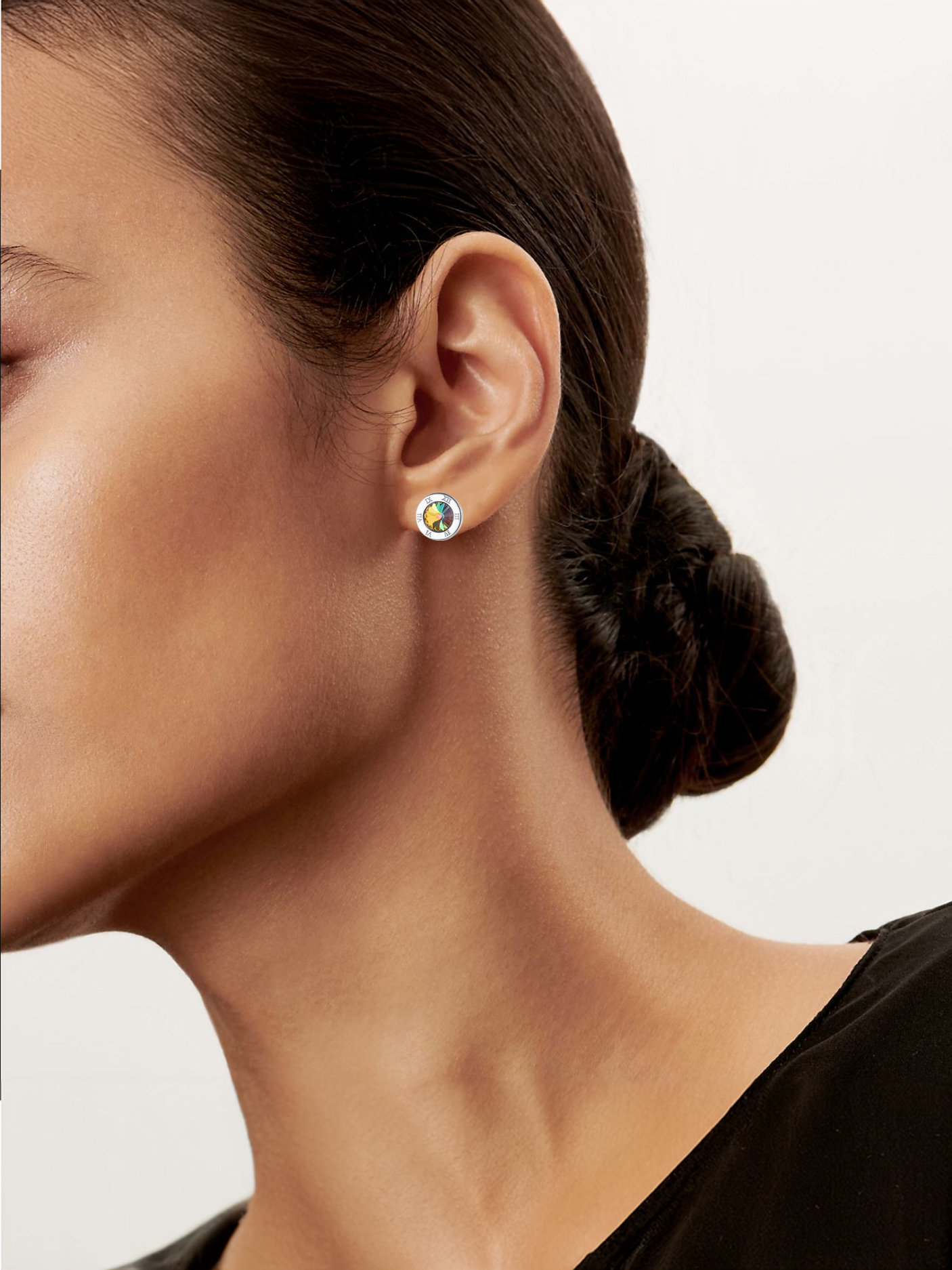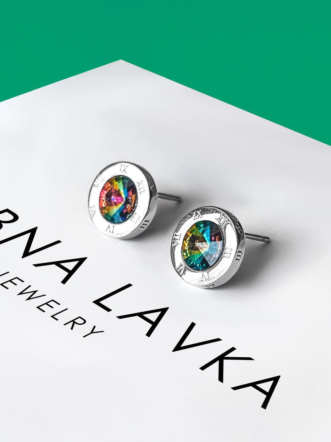 Jasne srebrne kolczyki z błyszczącą cyrkonią Swarovskiego, rodowane oraz niezawodne i wygodne zapięcie na sztyft.