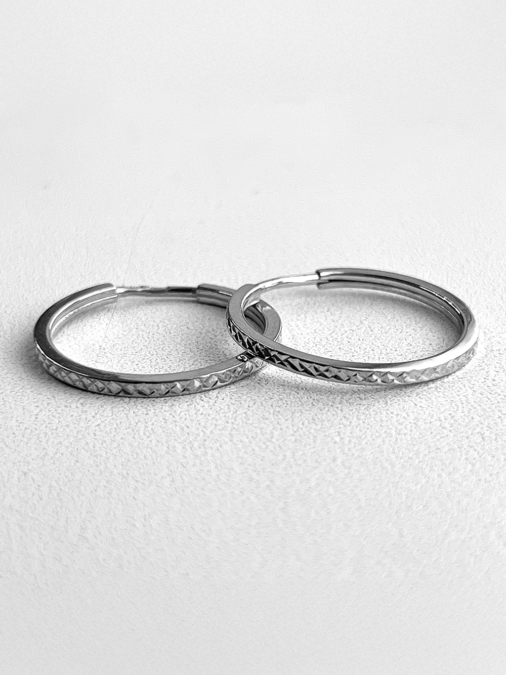 Стильніі срібні сережки-кільця із родієвим покриттям та алмазною гранню.