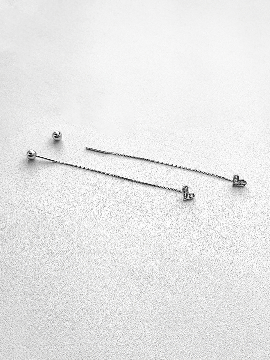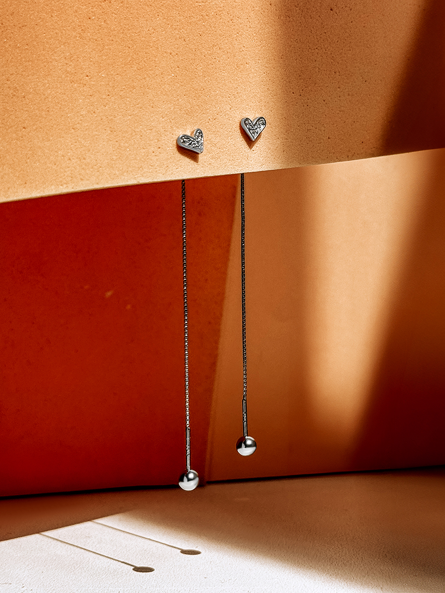 Ніжні срібні сережки-протяжуи у вигляді сердечок з фіанітами. Кульку з нижньої частини можете одягати на власний смак.