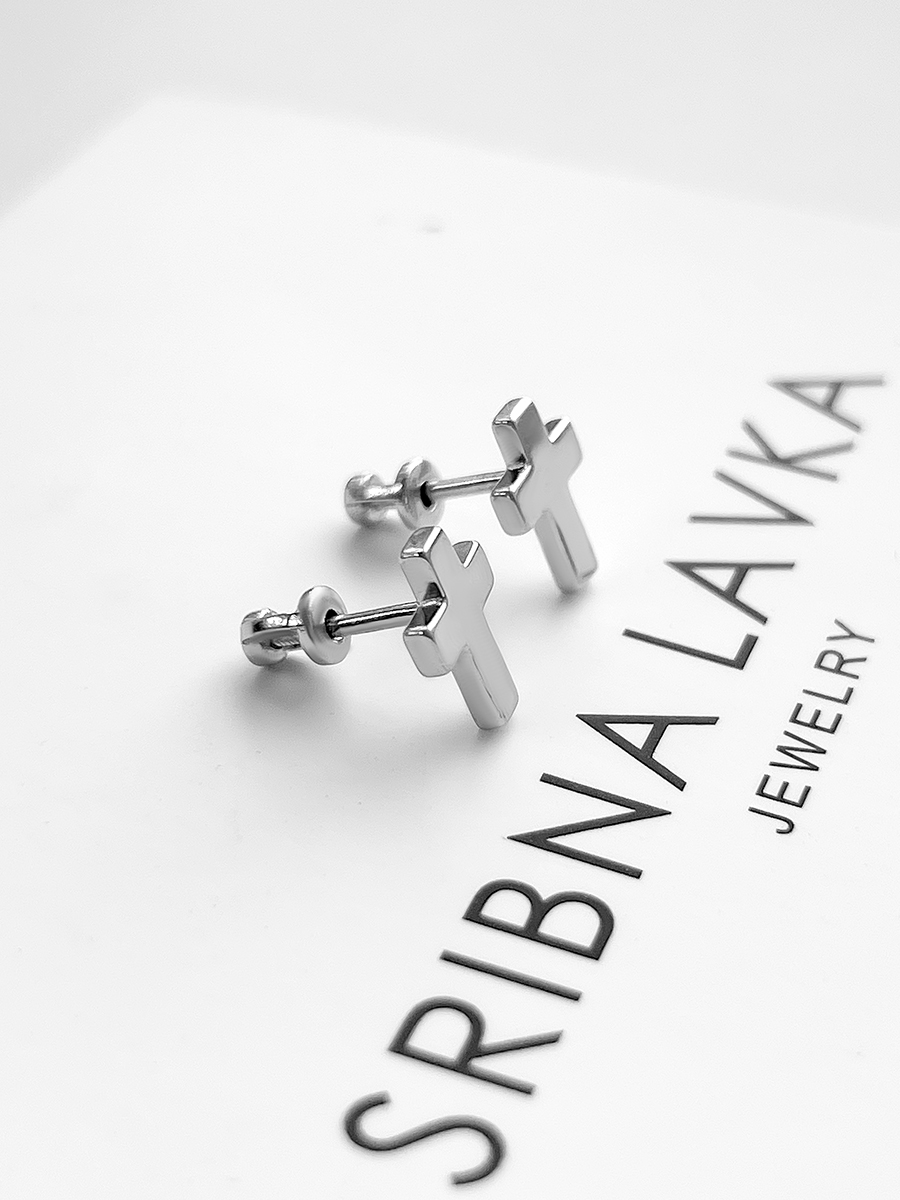 Лаконічні срібні пусети ""Хрестики"". Оснащені надійними гвинтовими застібками.