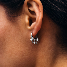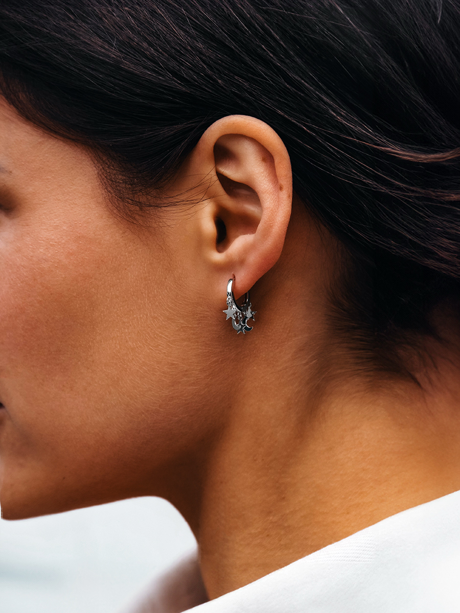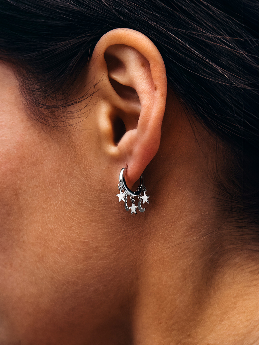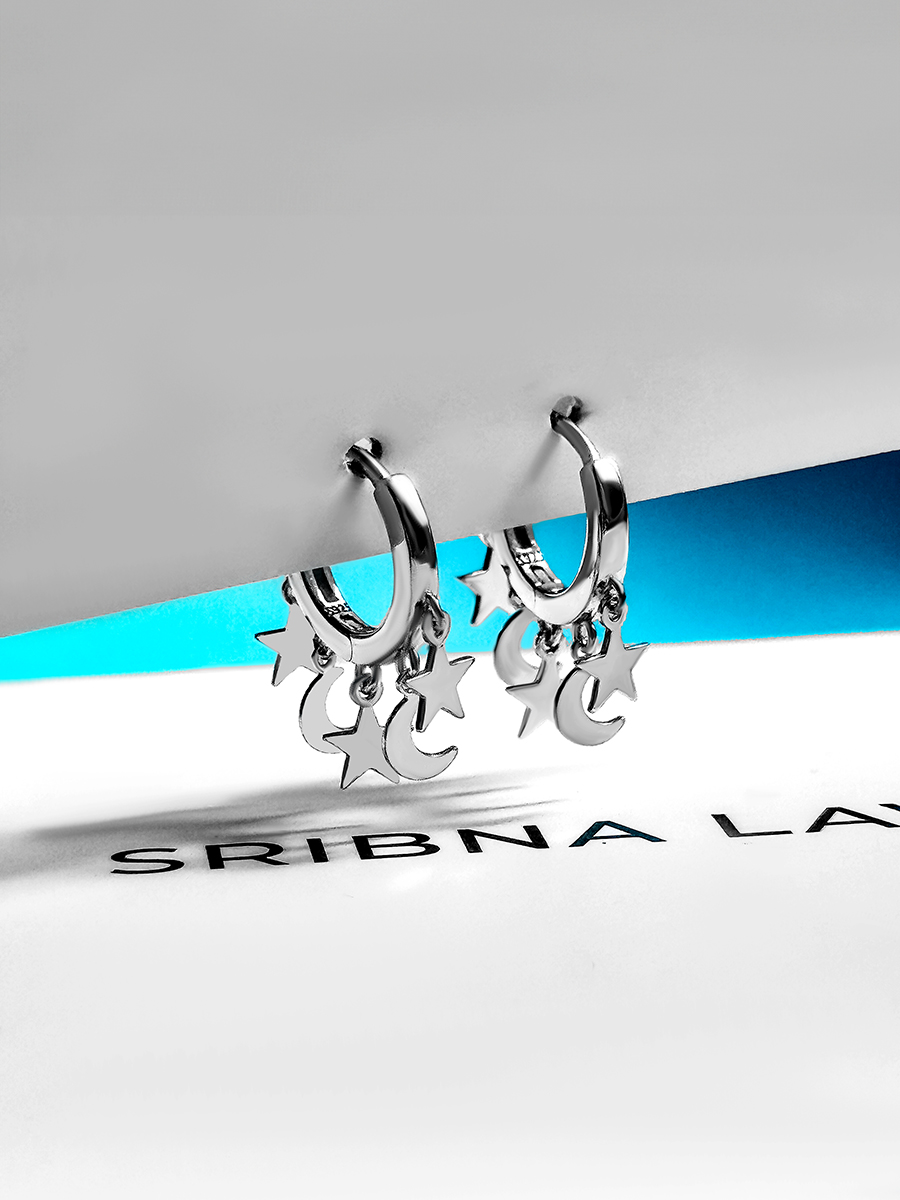 Стильні і лаконічні срібні сережки із родієвим покриттям та підвісками у вигляді зірочок та місяців.