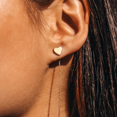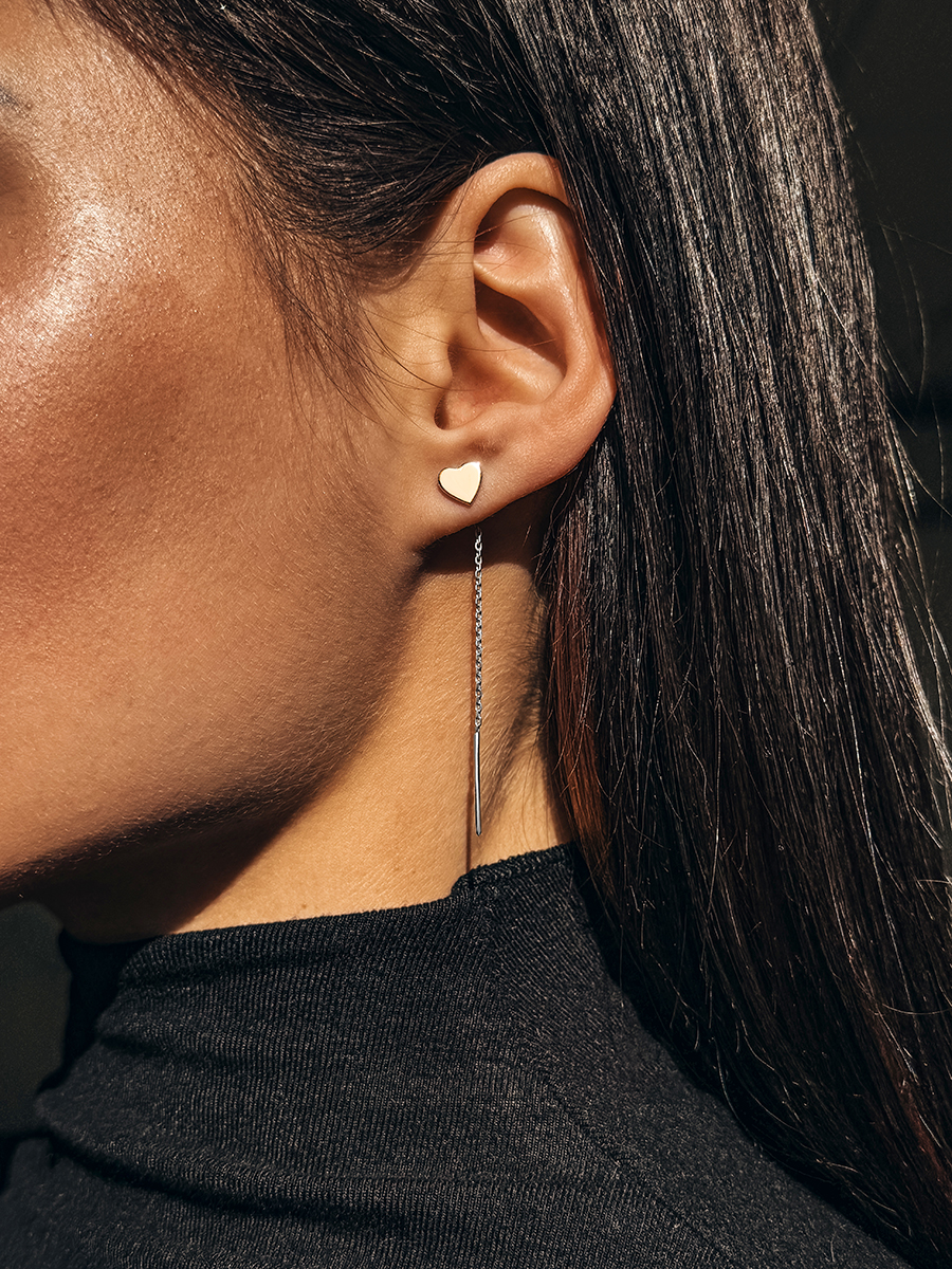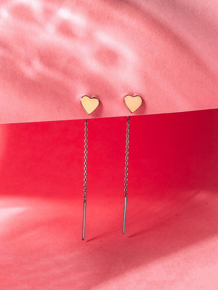 Срібні сережки протяжки у вигляді сердечок зі вставкою натурального золота. Сережки вкрито родієм для додаткового захисту та сяйва.