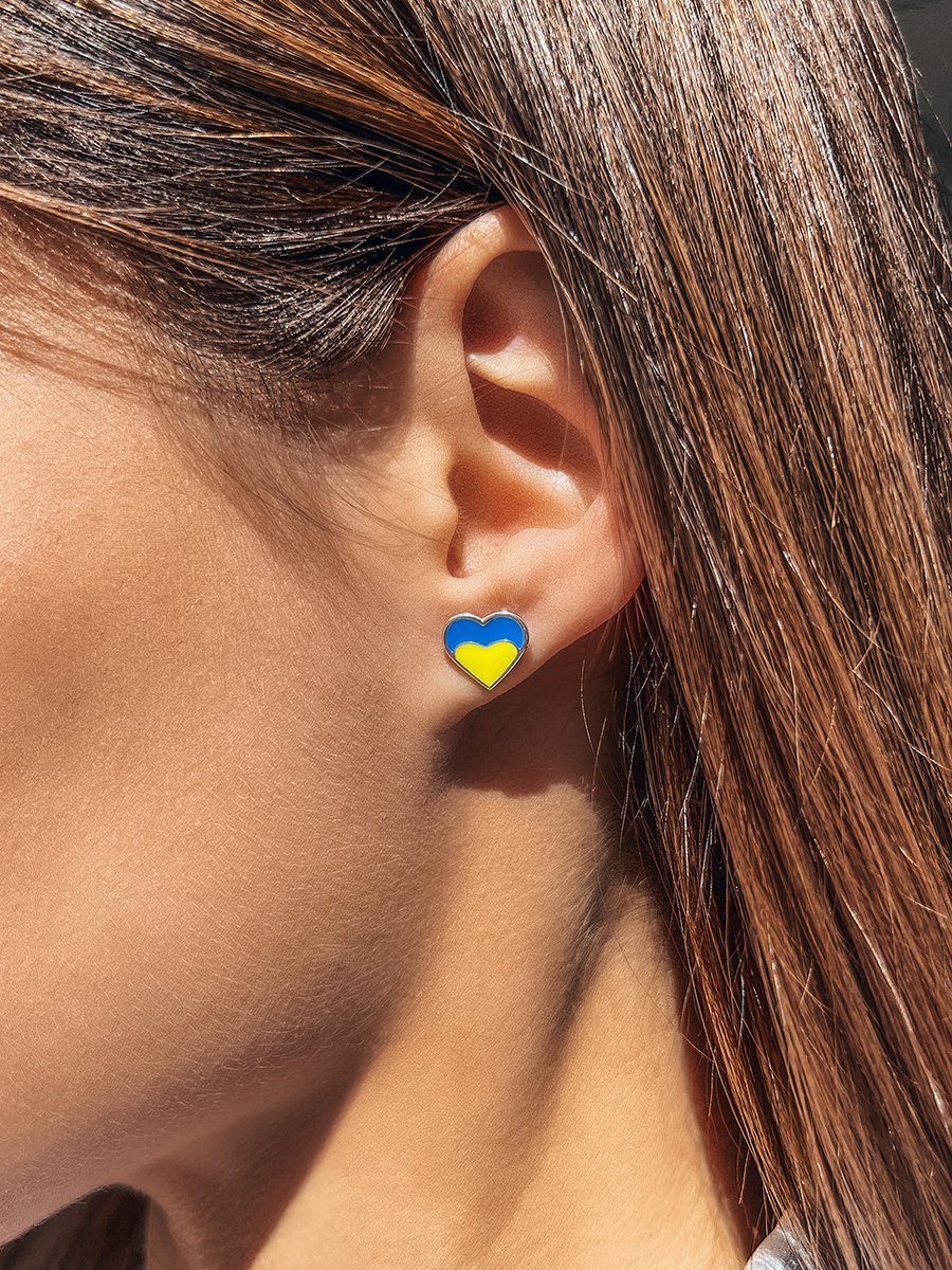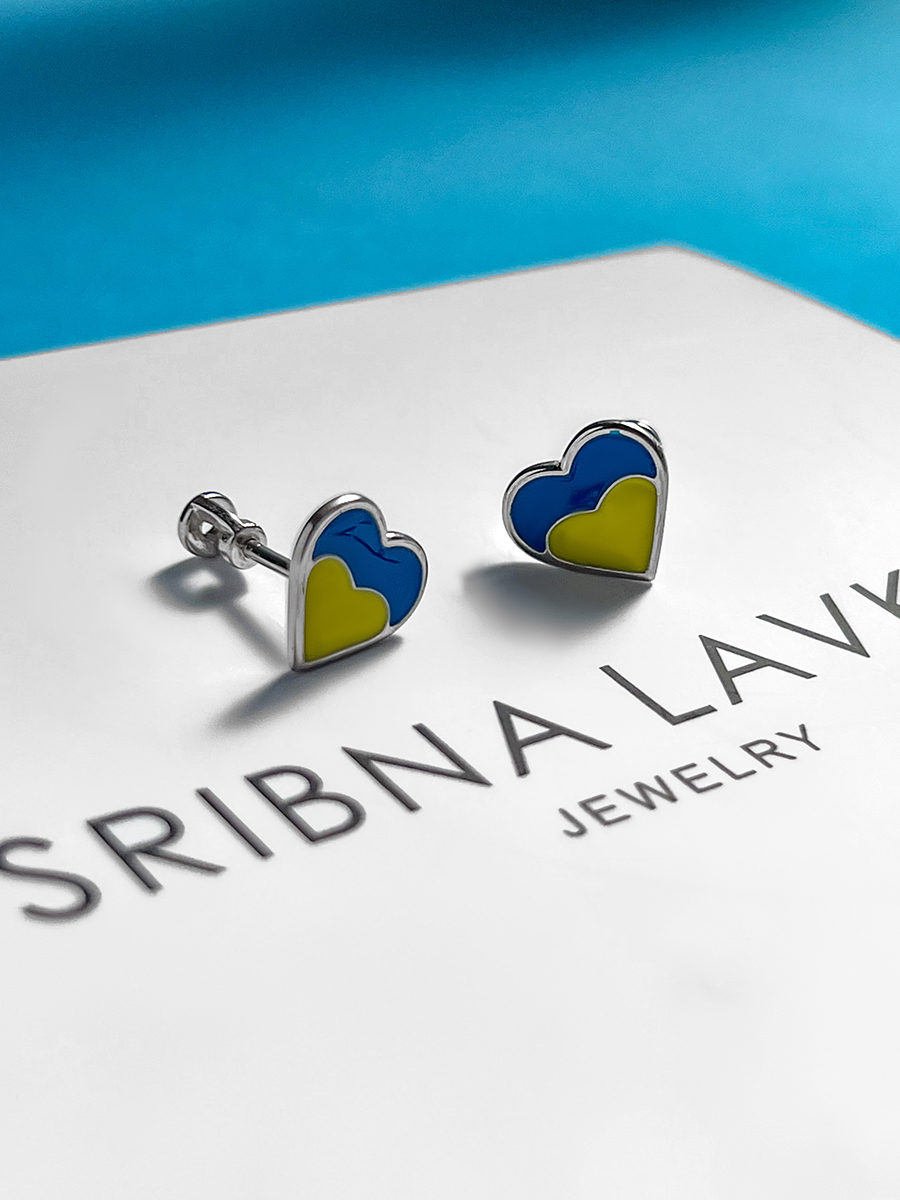 Срібні пусети з жовто-блакитною емаллю, родієвим покриттям та гвинтовими застібками.