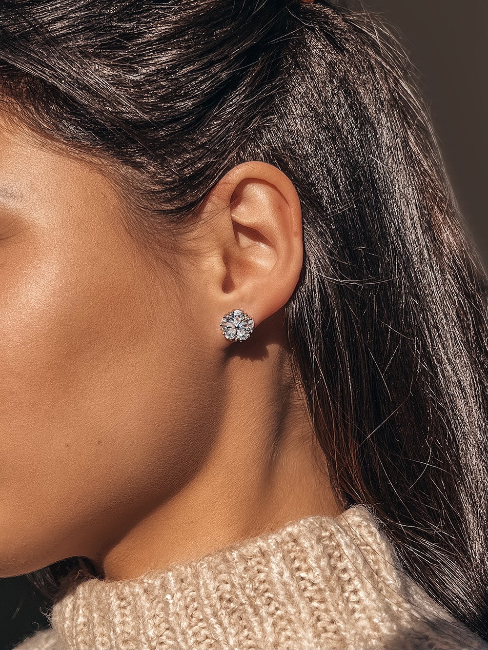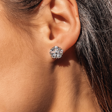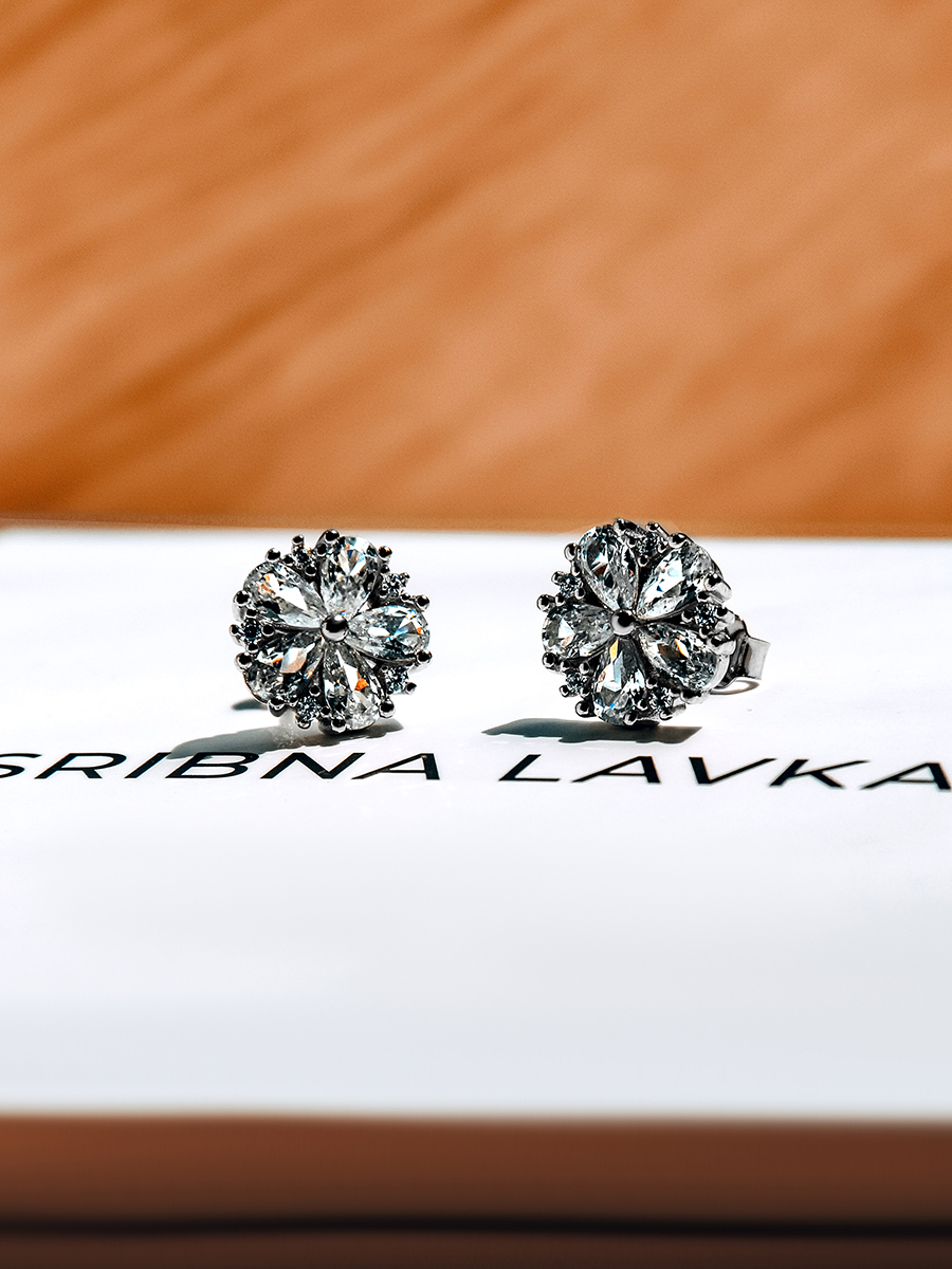 Яскраві пусети із родієвим покриттям, фіанітами з діамантовим ограновуванням та надійними і зручними штифтовими застібками.