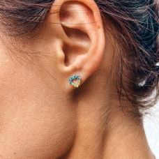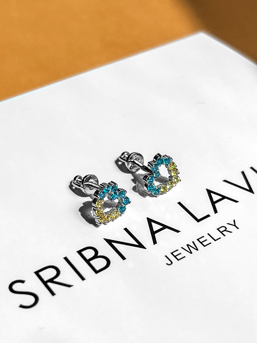 Срібні пусети у вигляді серця з жовто-блакитними фіанітами.