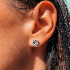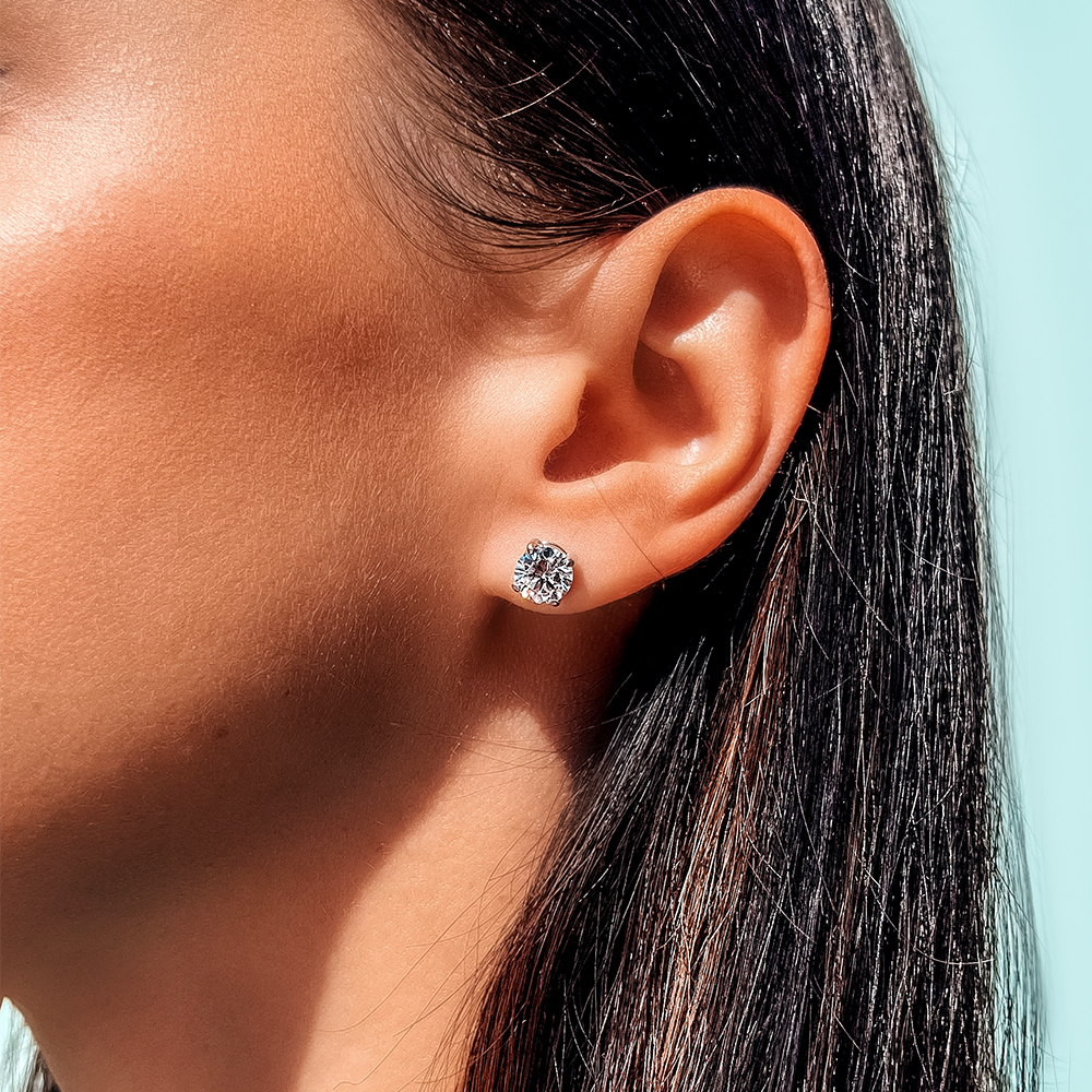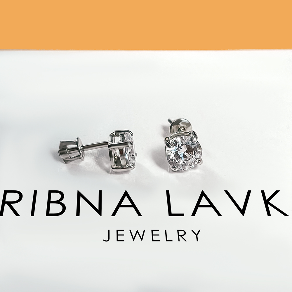 Срібні пусети із родієвим покриттям, фіанітами з діамантовим ограновуванням та гвинтовими застібками.