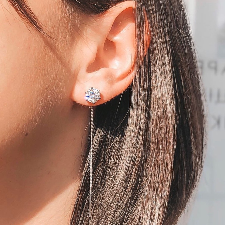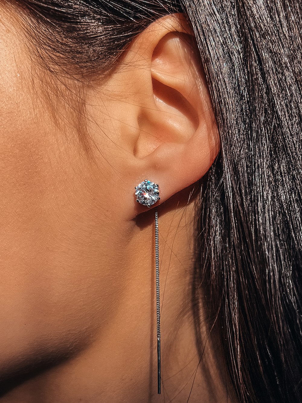 Срібні сережки-протяжки з фіанітами із діамантовим ограновуванням та родієвим покриттям.