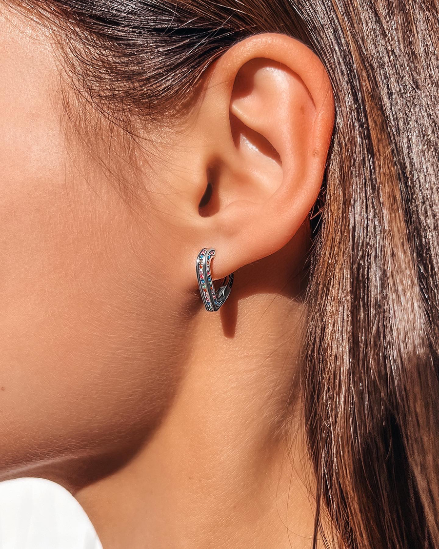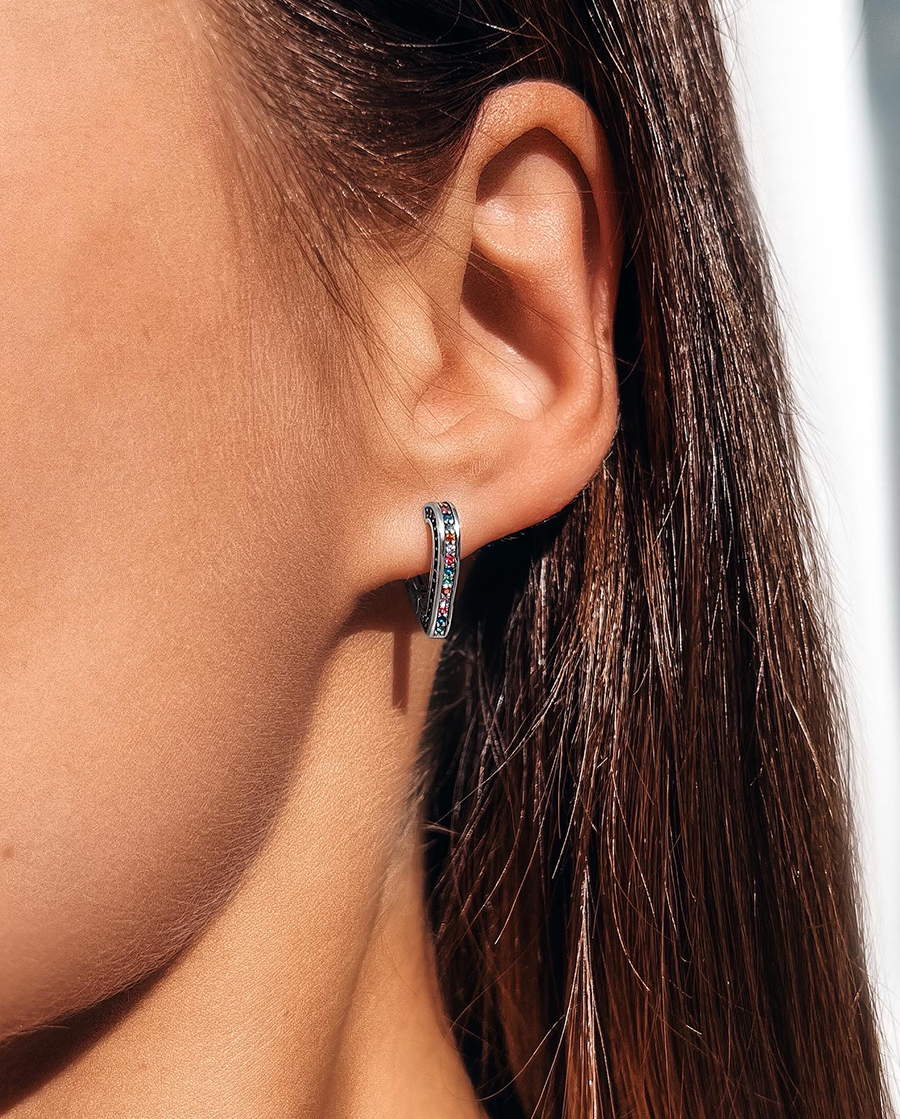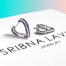 Сяючі срібні сережки з різнокольоровими доріжками фіанітів.