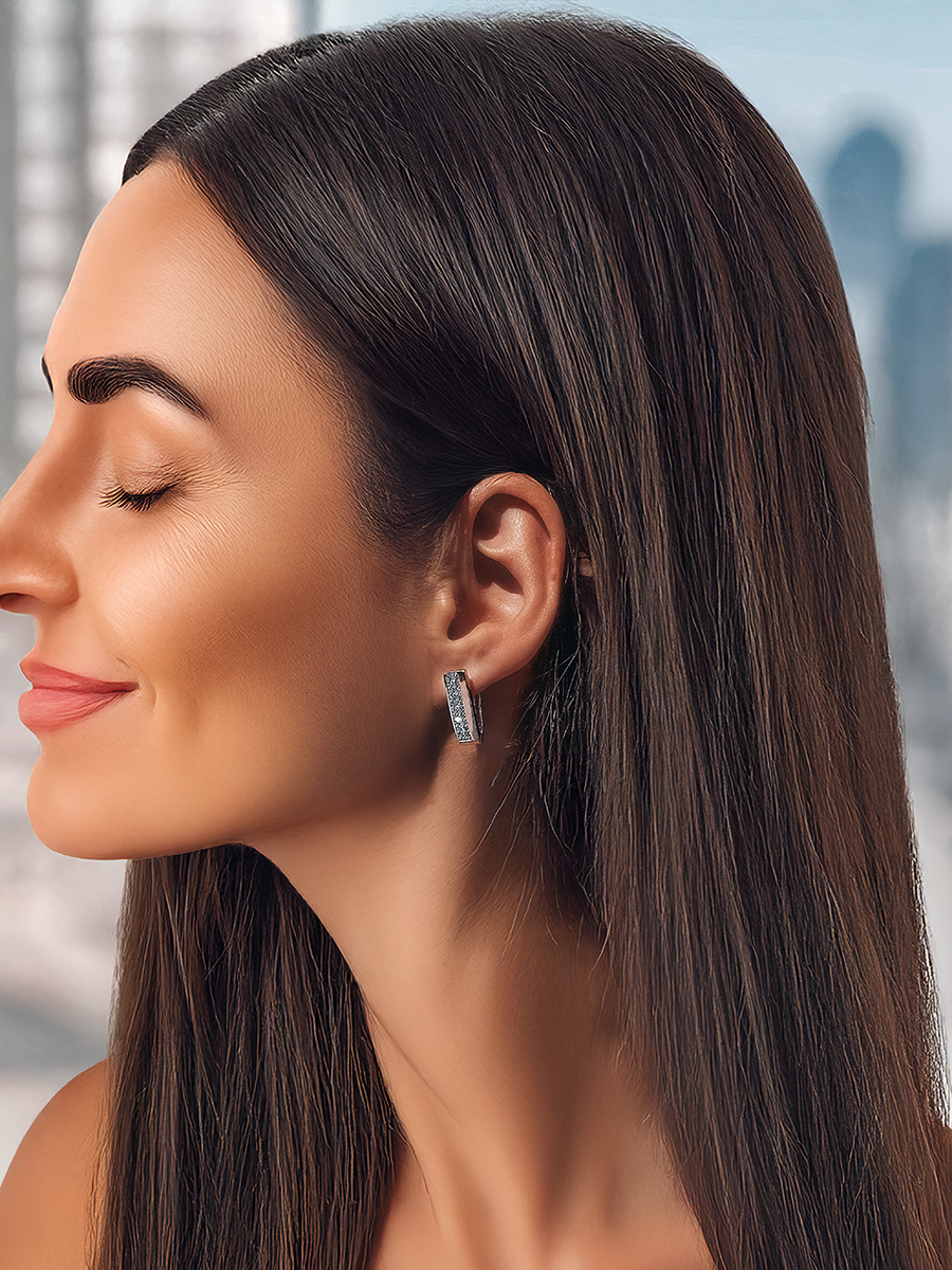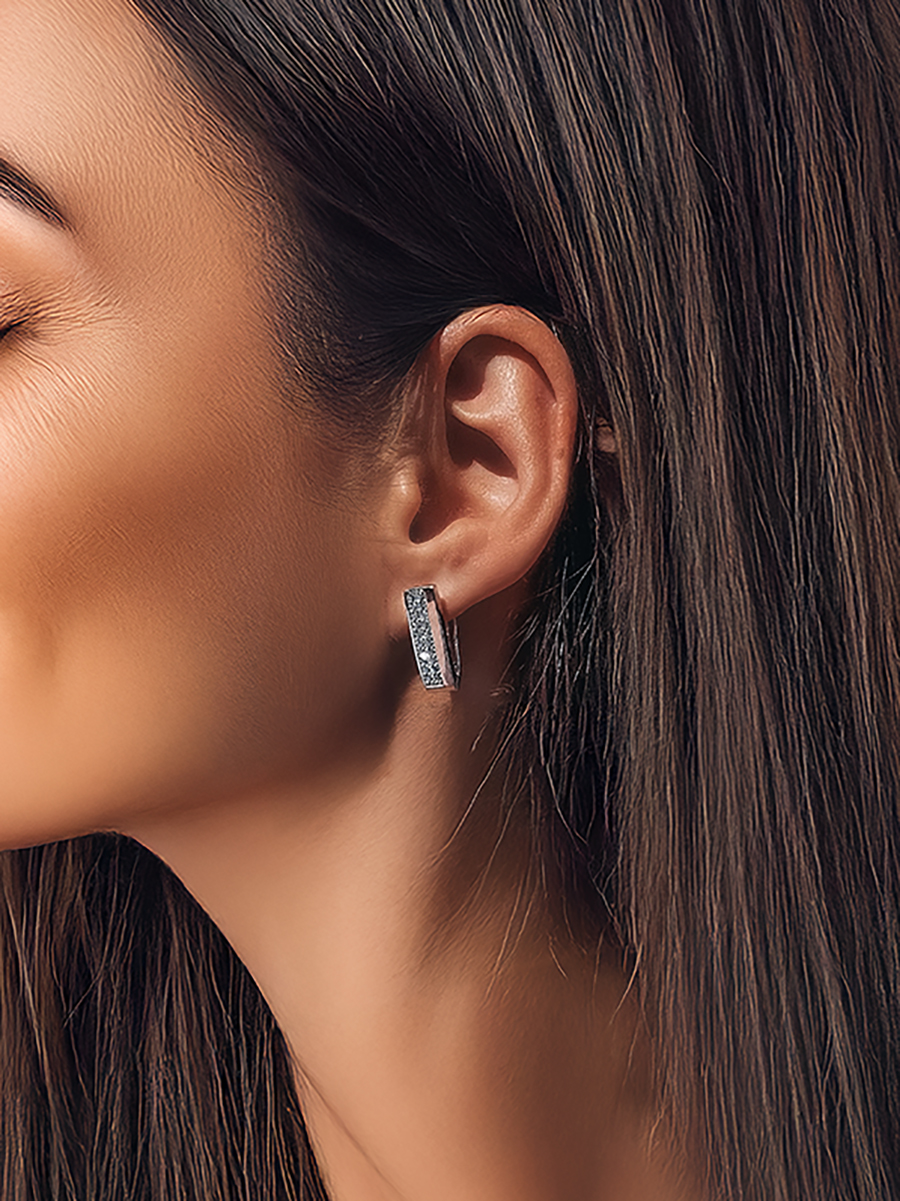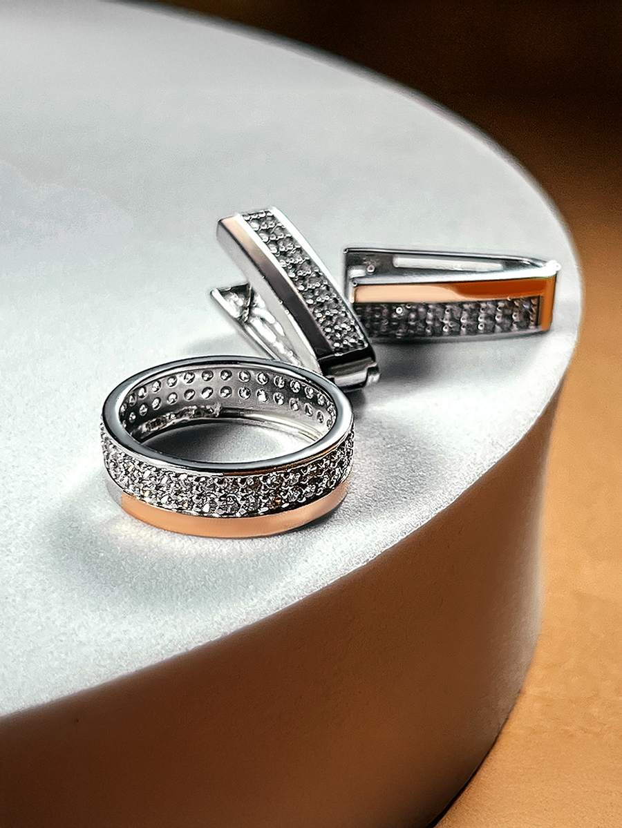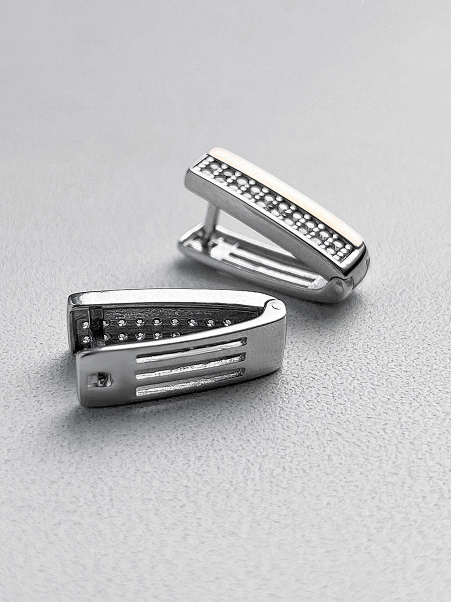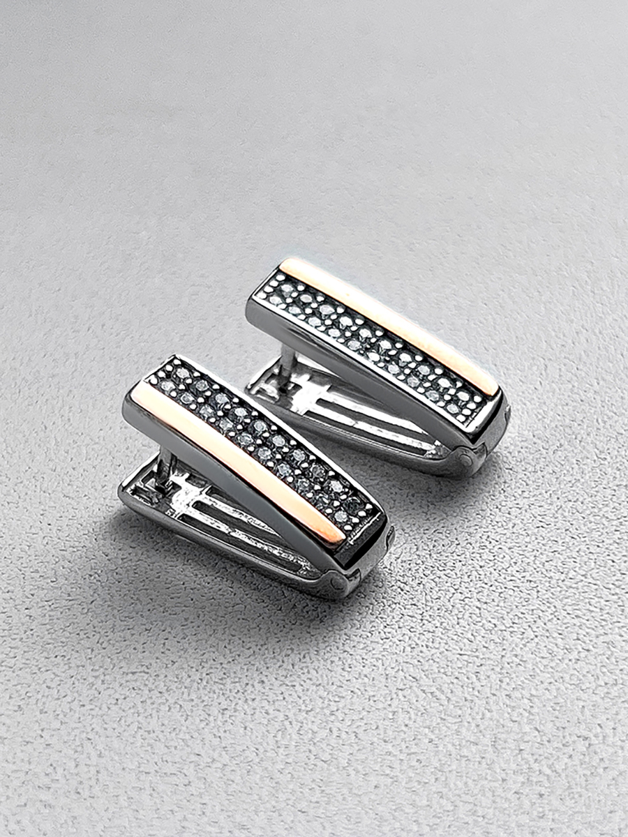 Ефектні срібні сережки із вставками натурального золота, фіанітів з діамантовим ограновуванням та родієвим покриттям.