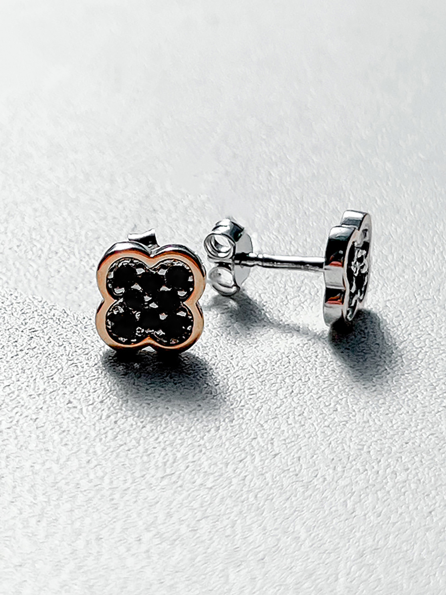 Срібні пусети із родієвим покриттям, чорними фіанітами, натуральним золотом та надійними і зручними штифтовими застібками.