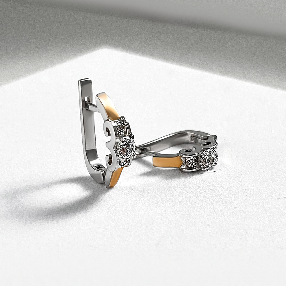 Сяючіі та незвичайніі срібні сережки із вставками натурального золота, фіанітів з діамантовим ограновуванням та родієвим покриттям.