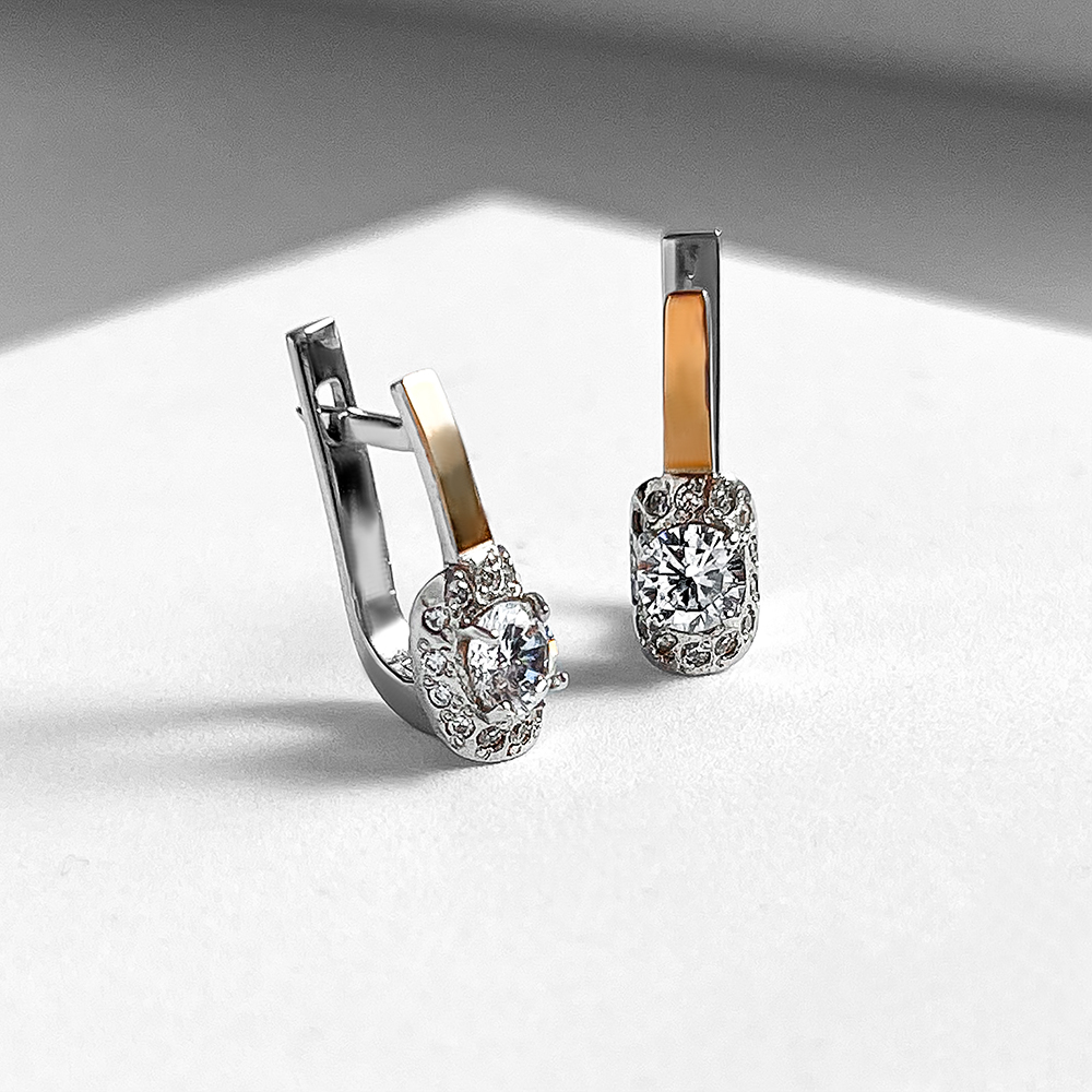 Сяючіі та незвичайніі срібні сережки із вставками натурального золота, фіанітів з діамантовим ограновуванням та родієвим покриттям.